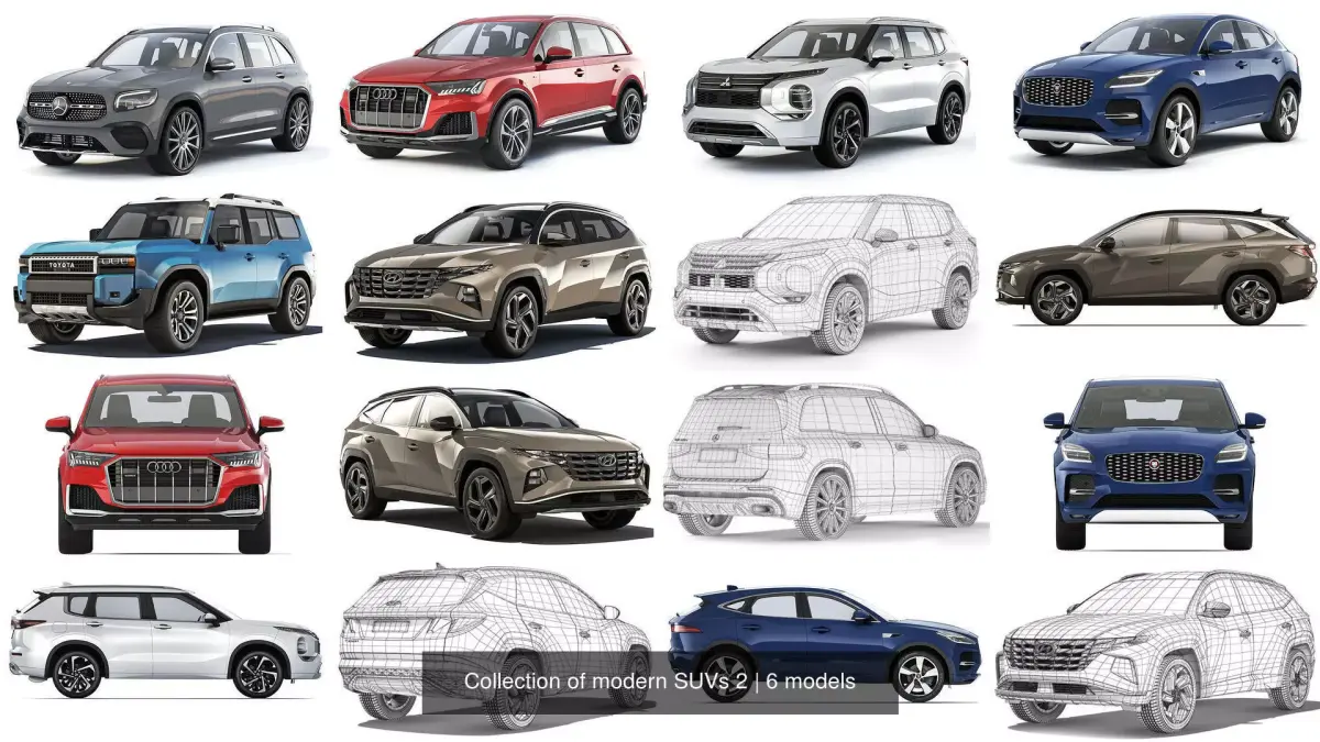 Collection of modern SUVs. The collection includes: Mitsubishi Outlander 2022, Hyundai Tucson 2021, Jaguar E-Pace 2021, Toyota Land Cruiser 250 Prado 2024, Audi Q7 S-Line 2020, Mercedes-Benz GLB 220d 2020.