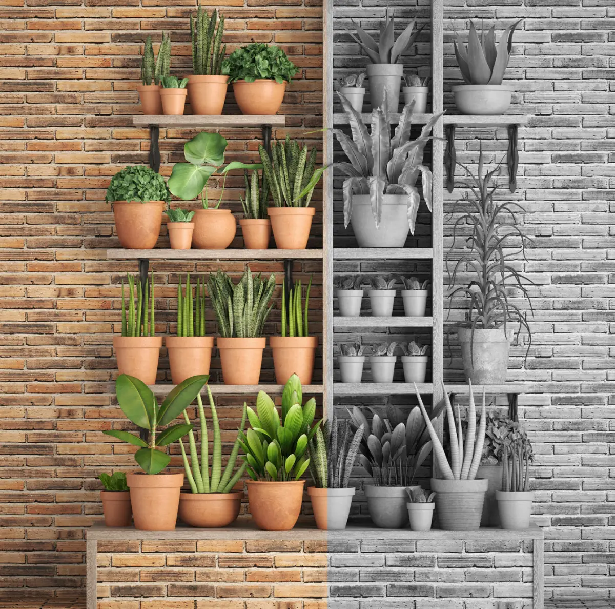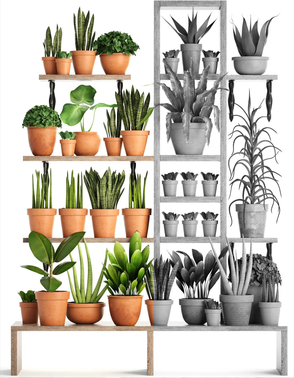Collection of plants in clay pots. PART 1The first part of the collection of plants in clay pots.In the scene there is brickwork (suitable for tiling)FicusPalm GrassCurculigo capitulatasansevieria cylindricasansevieriaBrick wallclay pots