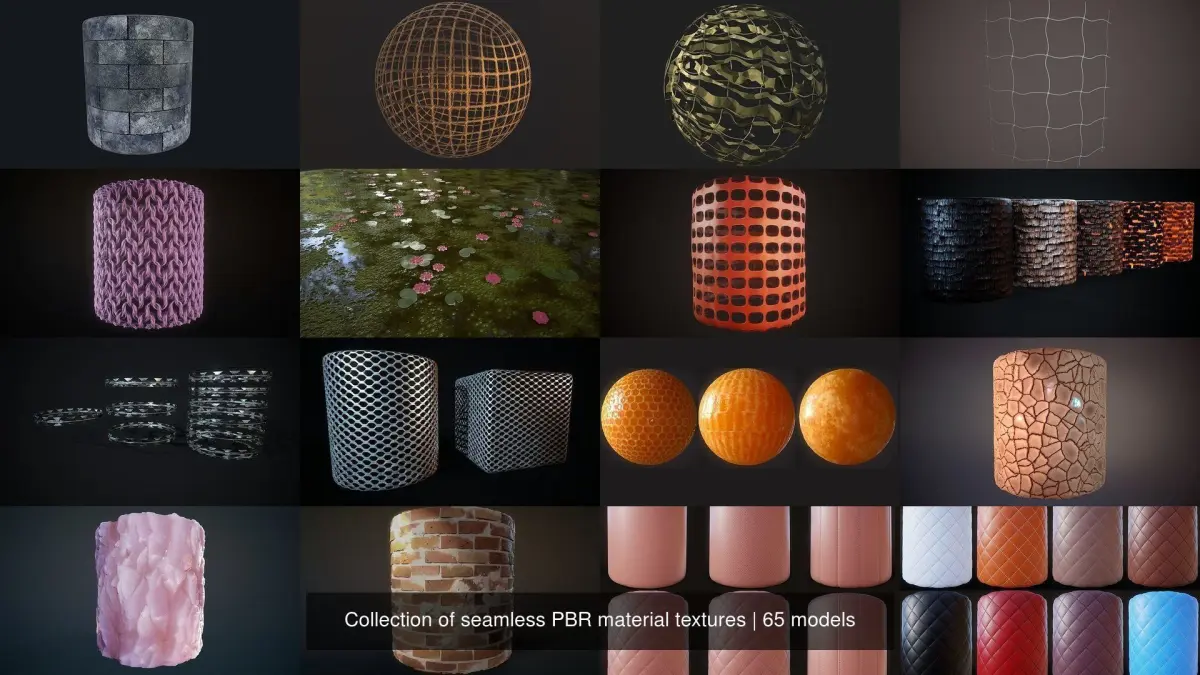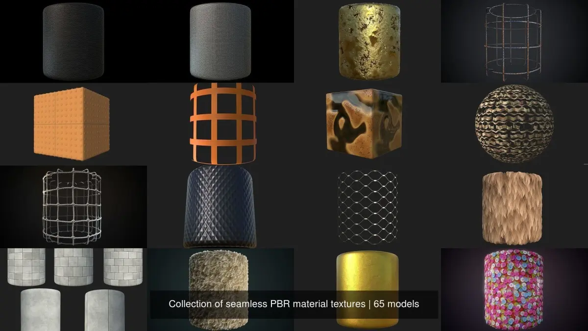 - Include 65 PBR materials with PNG 4k maps: BaseColor, Roughness, Metallic, Height, Normal, Ambient Occlusion, Opacity