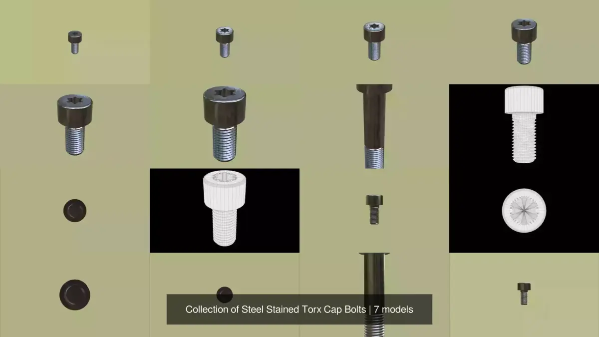 This is a complete collection of Steel Stained Torx Cap Bolts ranging from M3 T10 up to M12 T55, designed with high-precision modeling for engineering visualization and photorealistic rendering. Every model is fully optimized with 4K PBR textures for the highest level of detail and realism, making it perfect for product visualization, mechanical simulations, industrial designs, and technical animations.