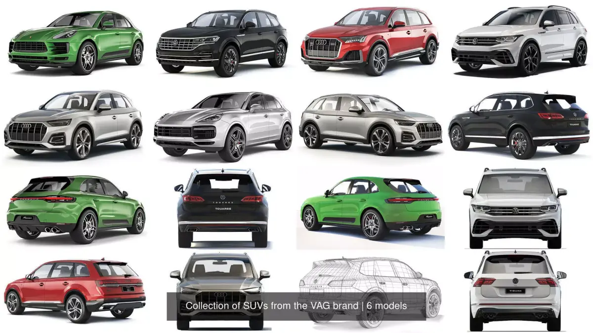 Collection of SUVs from the VAG brand. The collection includes: Porsche Cayenne Turbo 2018, Porsche Macan 2020, Audi Q5 Advanced 2022, Audi Q7 S-Line 2020, Volkswagen Touareg 2019, Volkswagen Tiguan R 2021. The main elements are prepared for TurboSmooth smoothing (2 Iteration). Body elements, wheels, wheels have been worked out. The interior is conditional.
