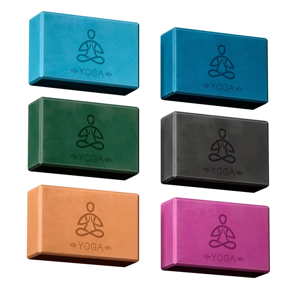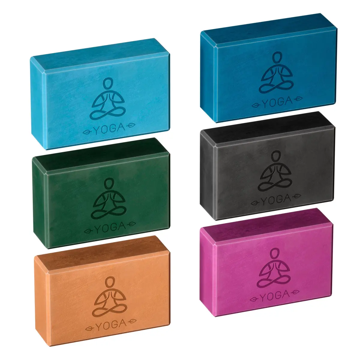 A set of colored blocks for Yoga, six different colors (black, purple, green, orange, blue, cyan) with a logo. The model is made for anti-aliasing.
