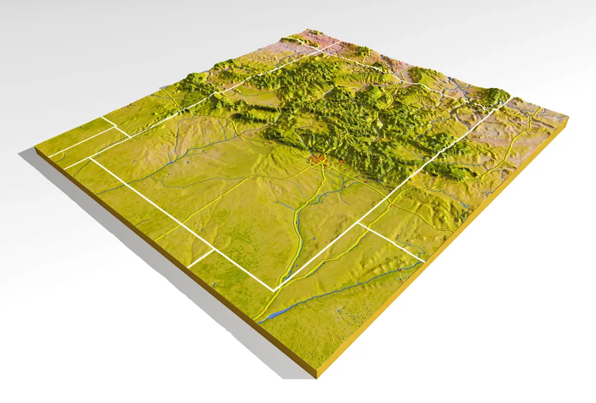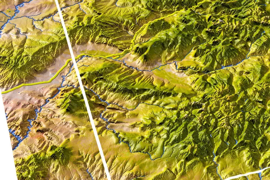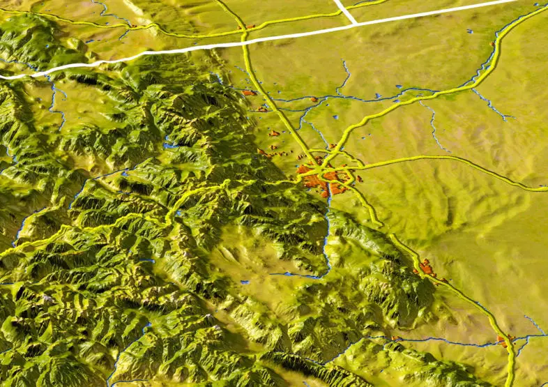 The 3D relief is taken from reprojected NASA shuttle radar topography data, with the elevation exaggerated. The relief is baked into a 750x679 mesh with 1024390 polys, 513654 vertices (for the main map).