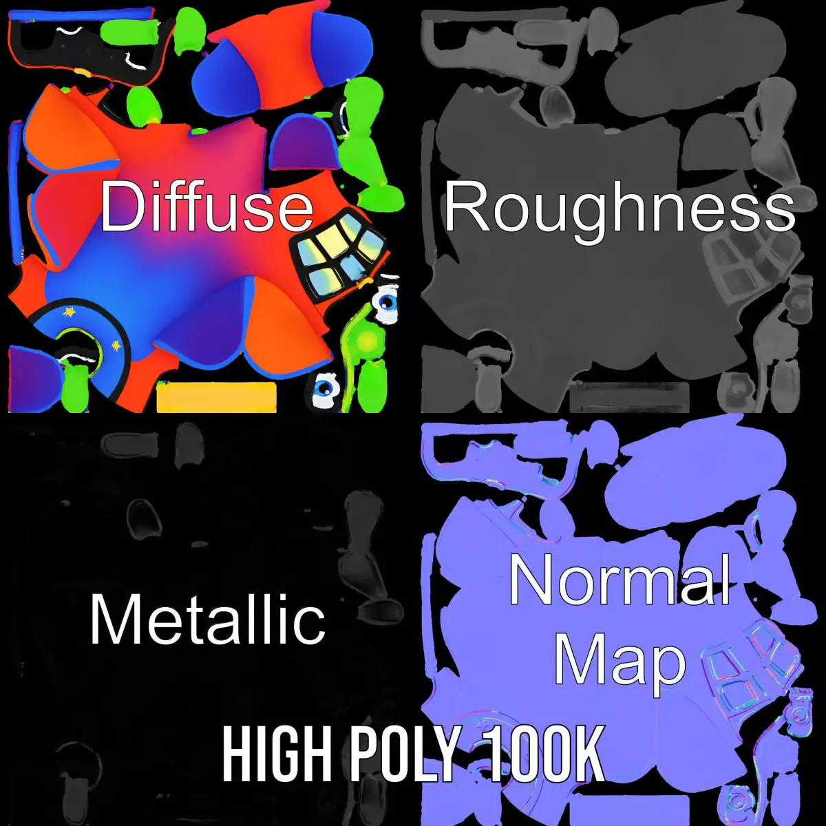 This vibrant and playful cartoon airplane model is perfect for use in children's animated series, educational games, or interactive apps. Its bright colors and cheerful design bring a sense of fun and imagination. Each model has 3 levels of detail: low-poly (1000 triangles for mobile), middle-poly (10,000 triangles for environment), and high-poly (100,000 triangles), which allows for the use of this model in production rendering (such as 3ds Max, Maya, Cinema 4D, Blender, Vray/Corona/Cycles and all others), game engines (Unity and Unreal compatible), and interactive presentations, providing a choice of detail based on the LOD System principle. The model's textures are PBR, Diffuse, NormalMap, and reflection/roughness/metallic, suitable for any modern rendering engine. All models accurately unwrapped and have no overlapping UVs. Textures are 4096*4096 in size. Please like and leave a comment if you enjoy this model.