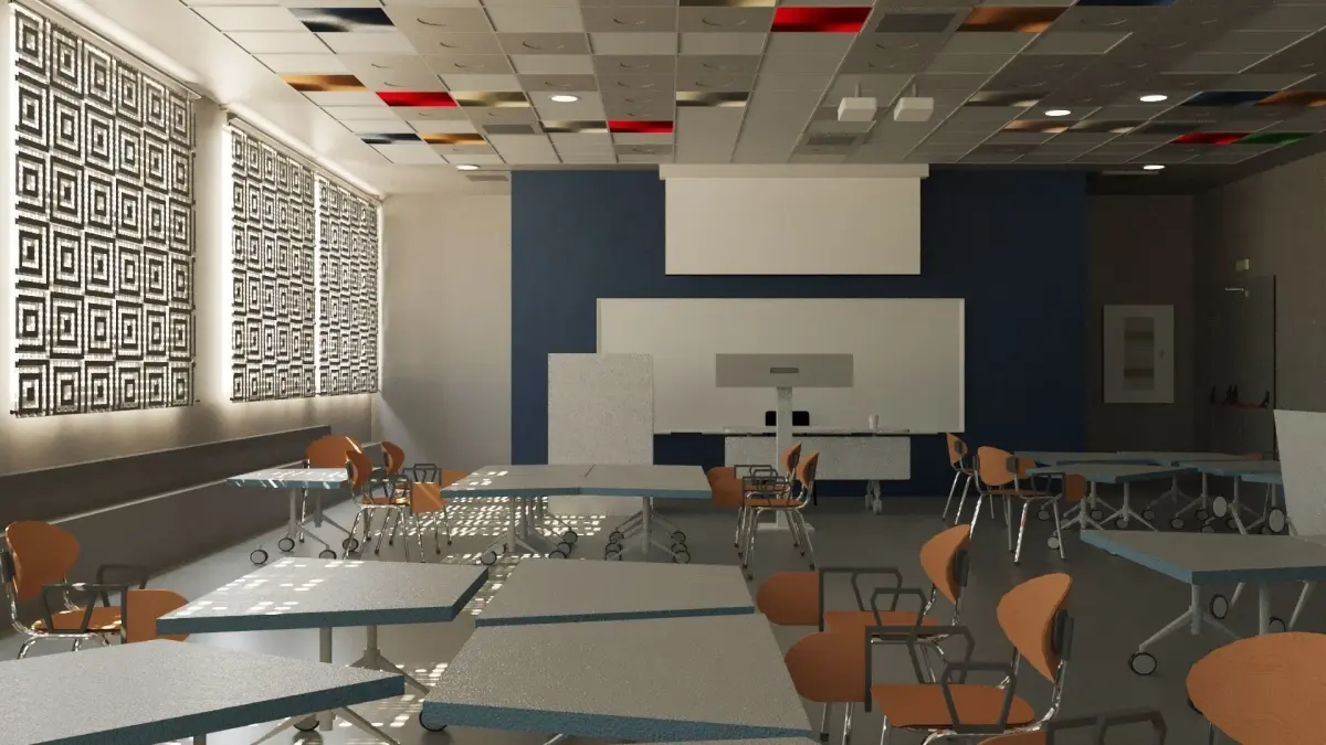 Colored Patterns on the Ceiling: Look up, and you'll be greeted by a visually stimulating masterpiece. The ceiling is adorned with a mesmerizing array of colored patterns that not only add aesthetic appeal but also serve as a source of inspiration. These patterns are designed to stimulate creativity and encourage out-of-the-box thinking, making every day in this classroom an artistic adventure.