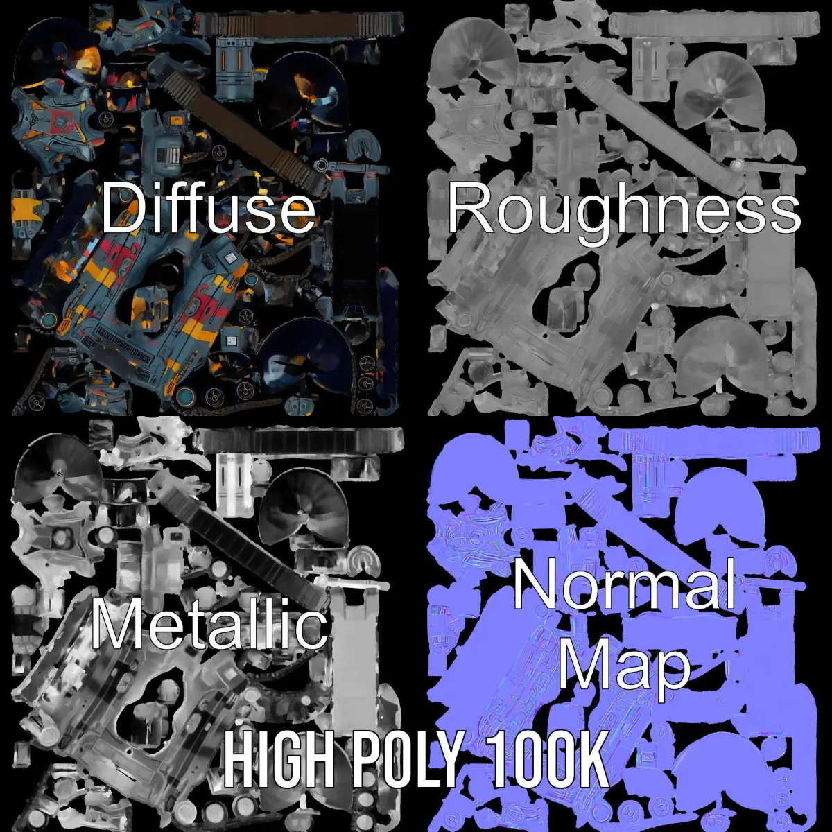 This Colorful Futuristic Tank Model Pack offers three levels of detail for diverse applications: low-poly (1000 triangles) for mobile, middle-poly (10,000 triangles) for environments, and high-poly (100,000 triangles) for production rendering. Designed for use in animation, games, virtual reality, and military simulations, this model boasts intricate details and vibrant textures. The textures include PBR, Diffuse, NormalMap, and reflection/roughness/metallic, which are compatible with modern rendering engines. All models are accurately unwrapped with non-overlapping UVs and textures at 4096*4096 resolution.