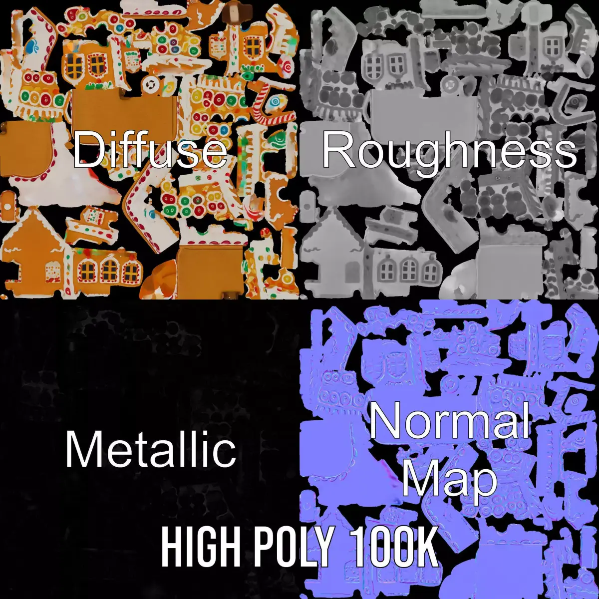This 3D model of a colorful gingerbread house captures the festive essence of holiday decoration, with vibrant candies and intricate icing details. Each model has 3 levels of detail: low-poly (1000 triangles for mobile), middle-poly (10,000 triangles for environment), and high-poly (100,000 triangles), which allows for the use of this model in production rendering (such as 3ds Max, Maya, Cinema4D, Blender, Vray/Corona/Cycles, and all others), game engines (Unity and Unreal compatible), and interactive presentations, providing a choice of detail based on the LOD System principle. Ideal for holiday animations, virtual environments, and festive marketing materials. The model's textures are PBR, Diffuse, NormalMap, and reflection/roughness/metallic, suitable for any modern rendering engine. All models are accurately unwrapped with no overlapping UVs. All textures are 4096x4096 in size. Please like and leave a comment if you enjoyed the model.