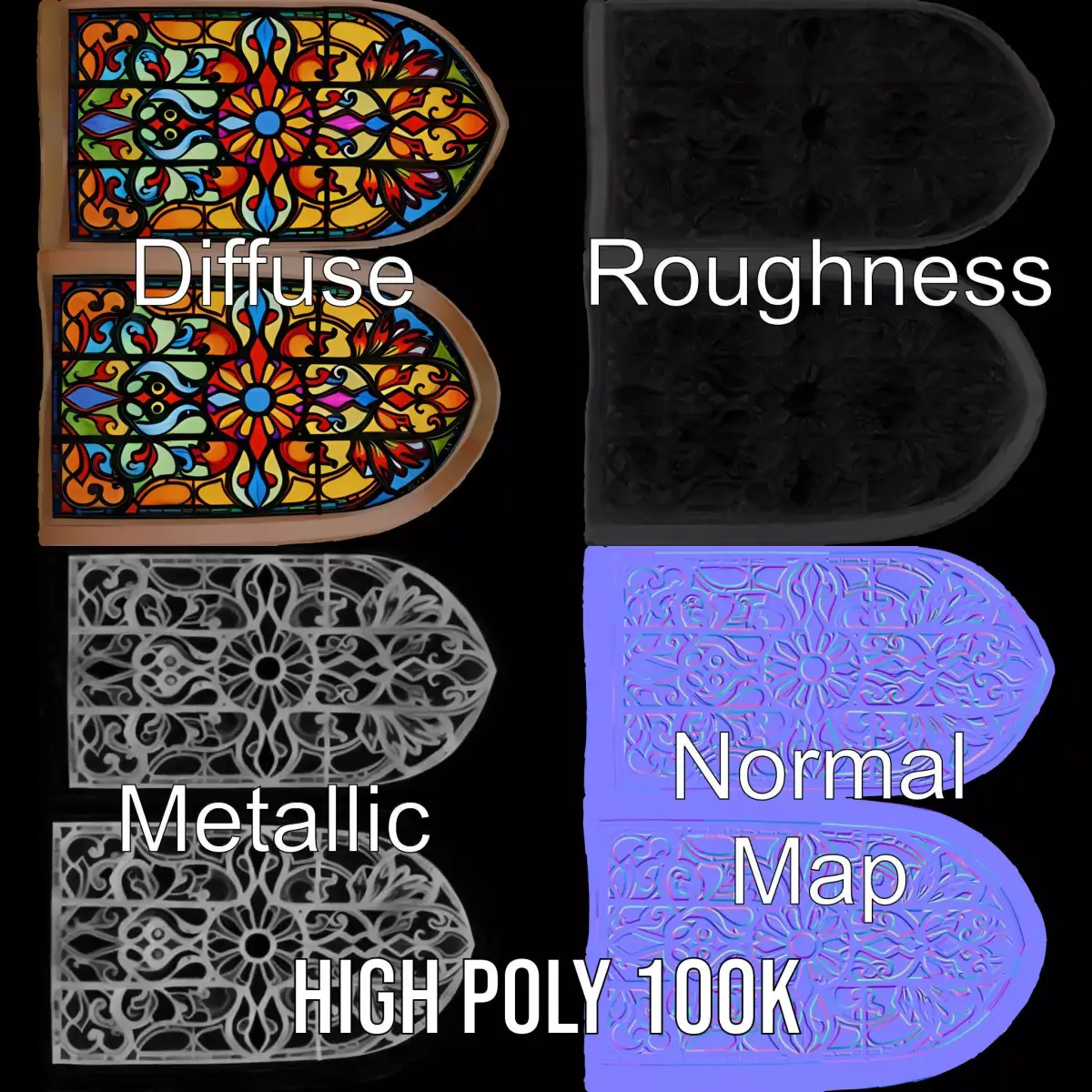This detailed 3D model features a vibrant Gothic-style stained glass window perfect for historical reconstructions and interior decor simulations. Each model has 3 levels of detail: low-poly (1000 triangles for mobile), middle-poly (10,000 triangles for environment), and high-poly (100,000 triangles), which allows for the use of this model in production rendering (such as 3ds Max, Maya, Cinema 4D, Blender, Vray/Corona/Cycles and all other), game engines (Unity and Unreal compatible), and interactive presentations, providing a choice of detail based on the LOD System principle. The model's PBR textures include Diffuse, NormalMap, and reflection/roughness/metallic, suitable for any modern rendering engine. All models accurately unwrapped and have no overlapping UV. Ideal for use in virtual reality scenes, architectural visualizations, and historical education materials. All textures are 4096*4096 in size. If you like this model, please leave a comment and a like!