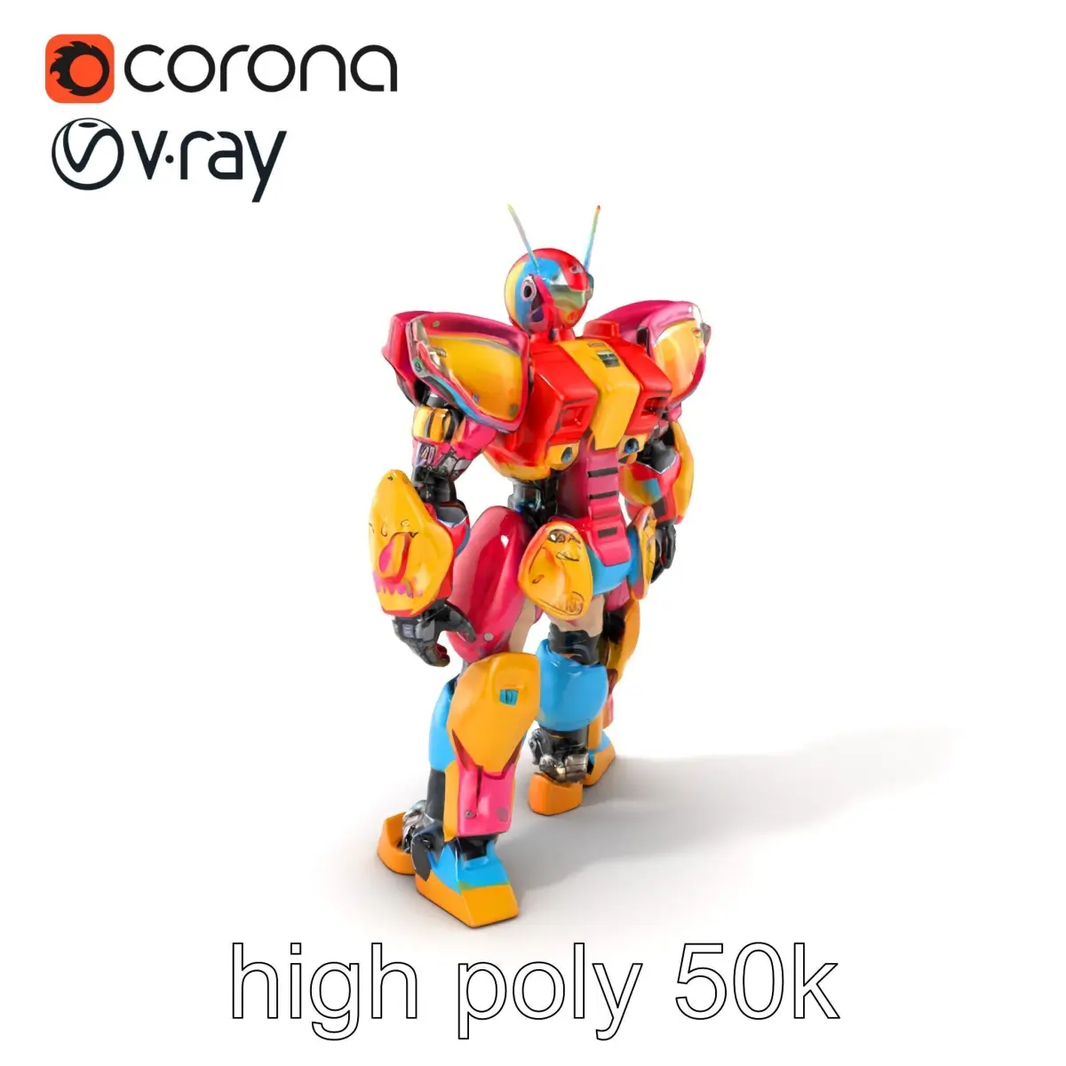 The vibrant humanoid battle robot model features bright, saturated armor and intricate design with realistic joints and polished metal textures, perfect for futuristic battle scenes and sci-fi settings. Its advanced mechanics make it ideal for animation and high-resolution renderings.