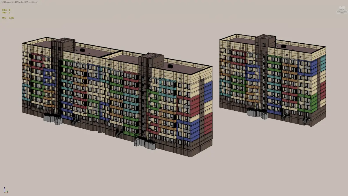 A detailed model of multi-story residential buildings with vibrant facades, ideal for urban and architectural visualizations.