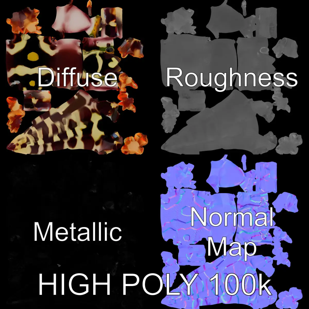 The salamander model is perfect for use in educational animations, realistic games, or detailed simulations, offering realism with PBR textures, including Diffuse, NormalMap, and reflection/roughness/metallic, all at a resolution of 4096x4096. The model is accurately unwrapped with no overlapping UVs, ensuring high-quality textures and rendering performance.