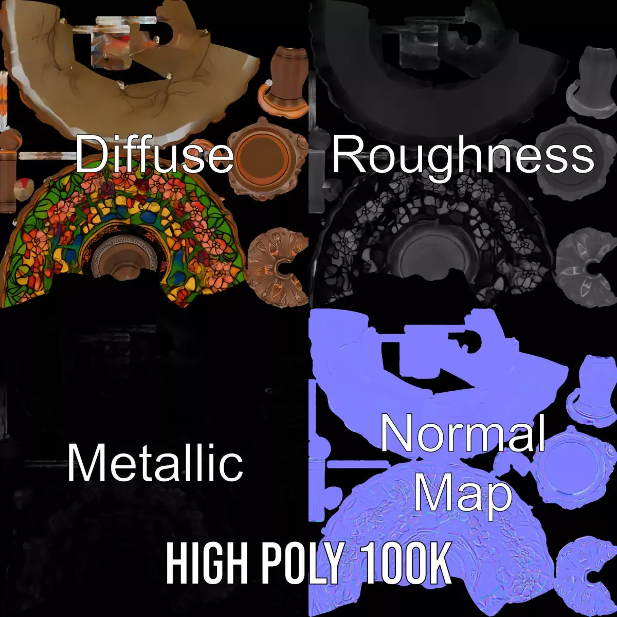 The Colorful Stained Glass Lamp model pack features a beautifully detailed lamp with a vibrant stained glass shade, perfect for adding a touch of elegance to any digital scene. Each model has 3 levels of detail: low-poly (1000 triangles for mobile), middle-poly (10,000 triangles for environment), and high-poly (100,000 triangles), which allows for the use of this model in production rendering (such as 3ds Max, Maya, Cinema4D, Blender, Vray/Corona/Cycles and all others), game engines (Unity and Unreal compatible), and interactive presentations, providing a choice of detail based on the LOD System principle. This model is ideal for use in virtual interiors, historical simulations, or as a centerpiece in game environments. The model's textures are PBR, Diffuse, NormalMap, and reflection/roughness/metallic, suitable for any modern rendering engine. All models are accurately unwrapped with no overlapping UVs, and textures are sized at 4096*4096 for high detail resolution. Please like and leave a comment if you enjoy the model.