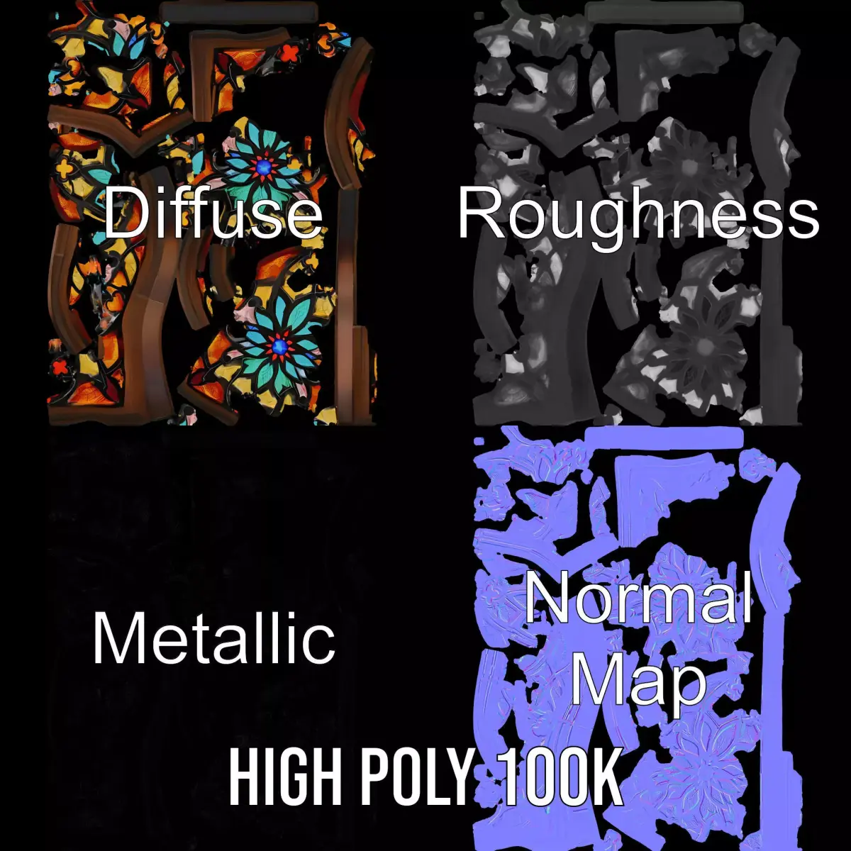 This colorful stained glass window model is perfect for architectural visualization, heritage restoration projects, and virtual reality experiences. Its vibrant colors and intricate patterns enhance any scene with a touch of elegance and authenticity. Each model has 3 levels of detail: low-poly (1000 triangles for mobile), middle-poly (10,000 triangles for environment), and high-poly (100,000 triangles), which allows for the use of this model in production rendering (such as 3ds Max, Maya, Cinema4D, Blender, Vray/Corona/Cycles and all others), game engines (Unity and Unreal compatible), and interactive presentations, providing a choice of detail based on the LOD System principle. The model's textures are PBR, Diffuse, NormalMap, and reflection/roughness/metallic, which are suitable for any modern rendering engine. All models are accurately unwrapped with no overlapping UVs. All textures are 4096*4096 in size. Please like and leave a comment for the model if you liked it.