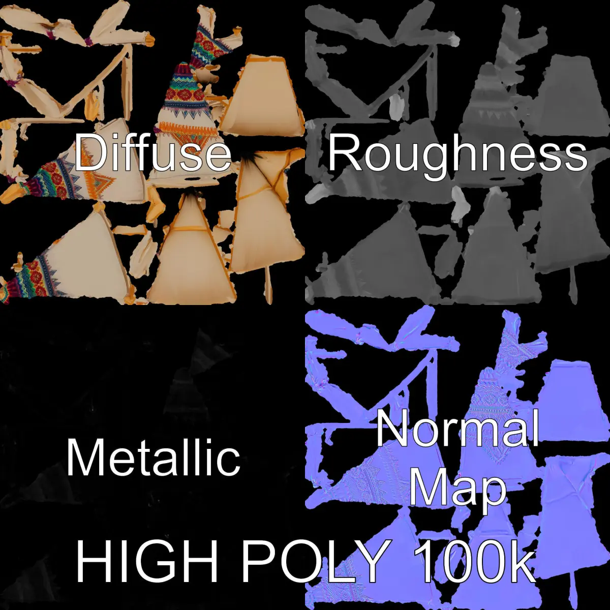 This colorful teepee tent model pack is ideal for creating engaging scenes in both games and animations. The model features three detail levels: low-poly for mobile applications, middle-poly for environment rendering, and high-poly for production builds. With vibrant textures and a detailed wood frame, the tent’s design captures the essence of a playful and imaginative setting.