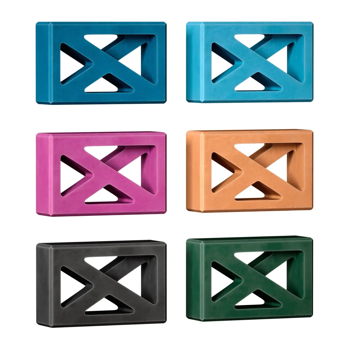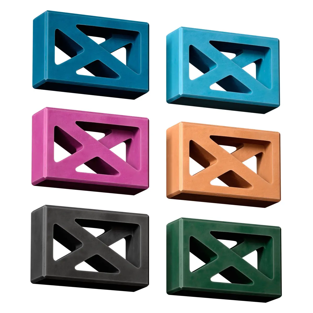 A set of colorful yoga blocks with cutouts. Block colors: black, orange, green, purple, blue, cyan. The model is made for anti-aliasing.