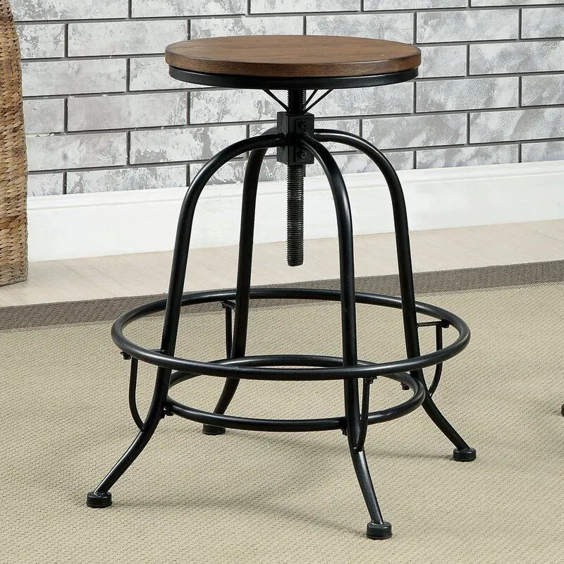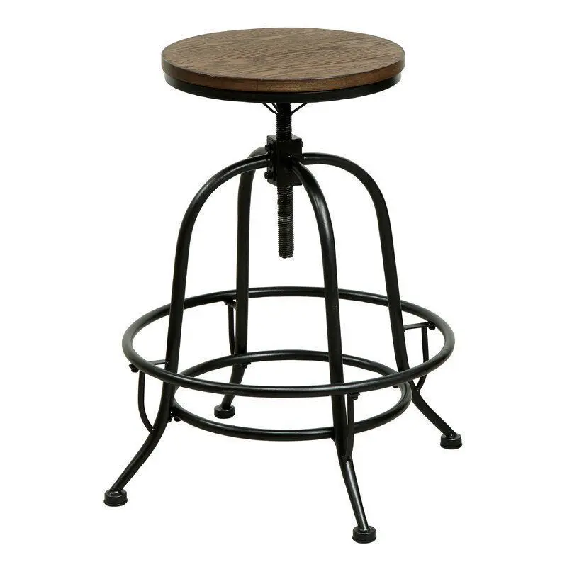 - This industrial Adjustable Height Swivel Bar Stool features a sleek industrial-inspired look whose round wood panel seat you can easily adjust to your preferred height. Set atop a sturdy metal frame, an attached footrest provides additional comfort while the flared legs add extra stability.