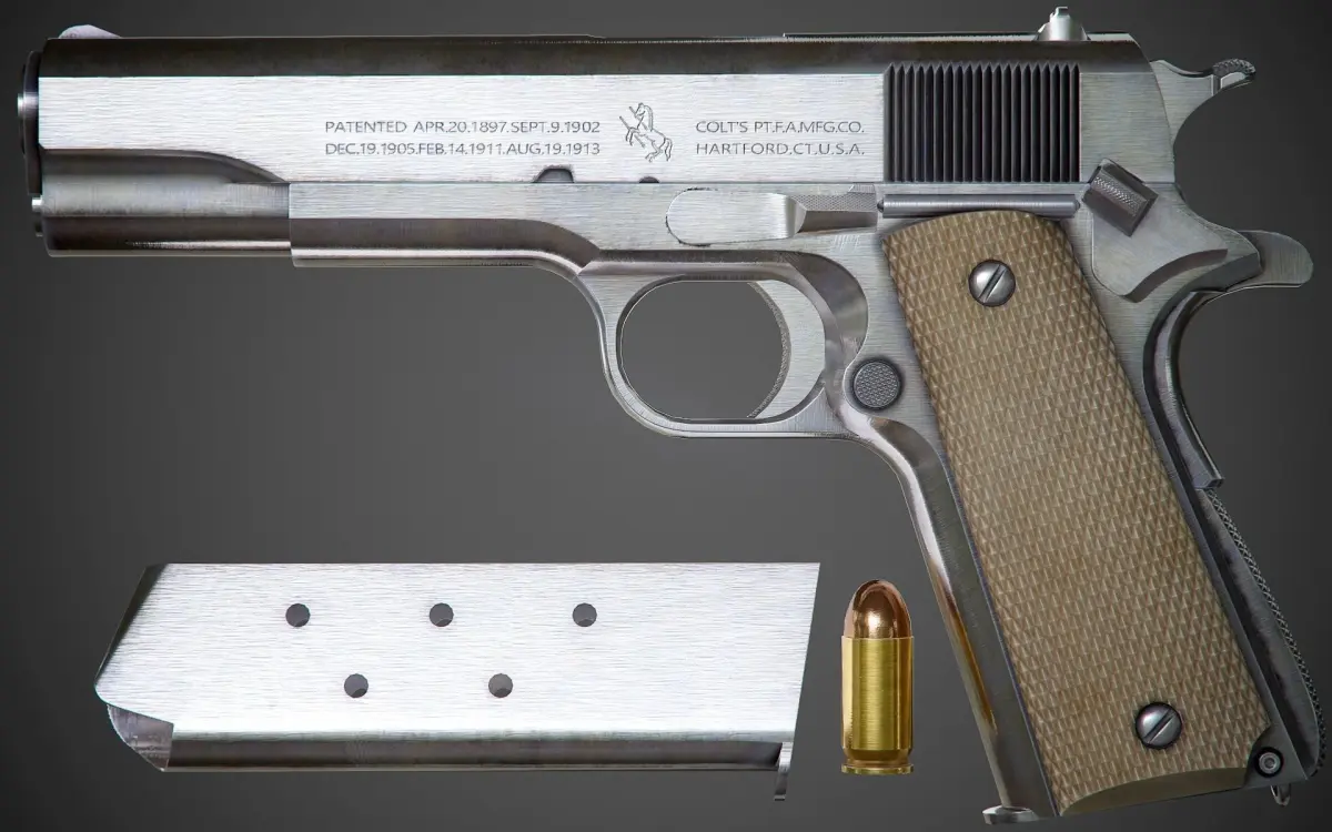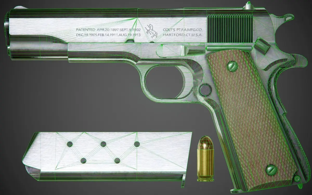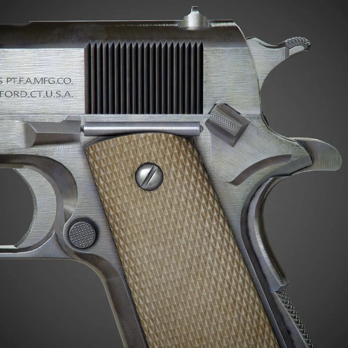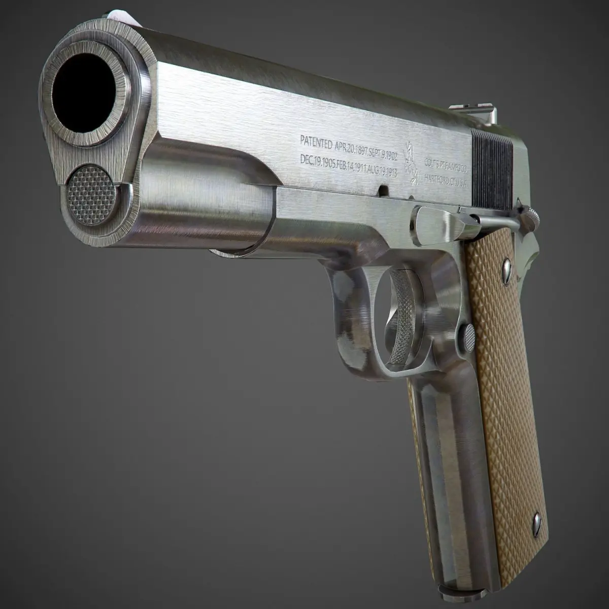 High quality model of the famous pistol Colt M1911 A1 with extra detail textures. Modification with chromium-plated metal.Used by the US Army during the WWII.