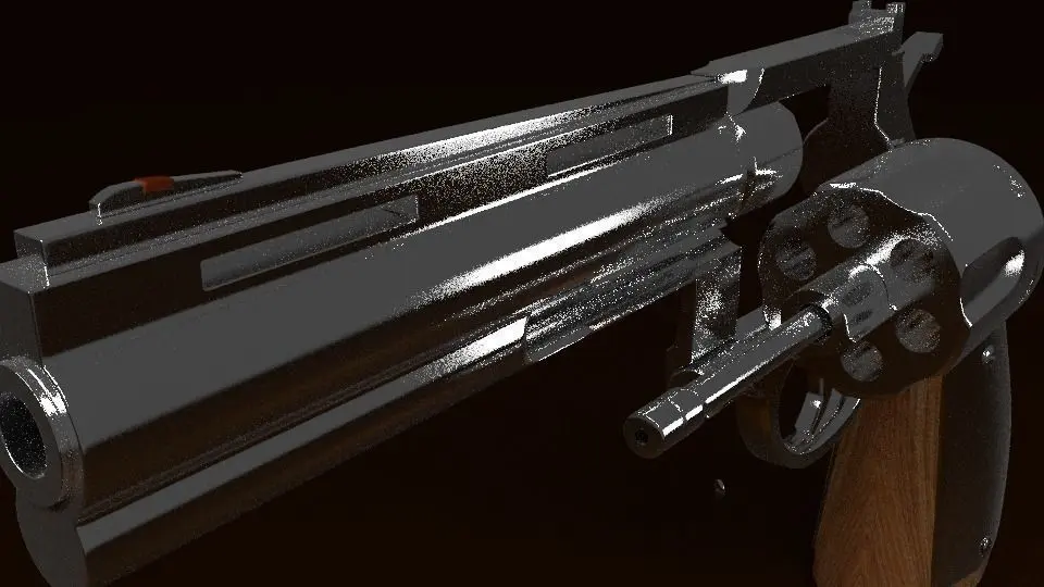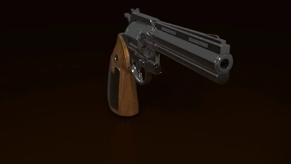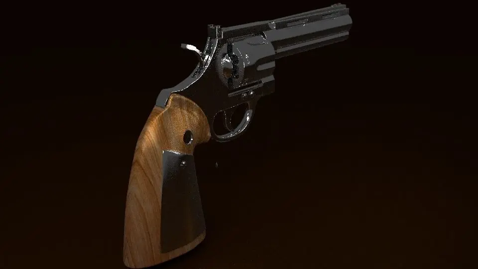 6- charge revolver with wooden hilt and metallic main tale. It's cylinder can be flipped out and spunned. You can find 3d view near photos above