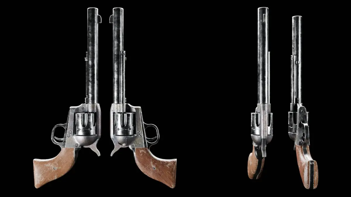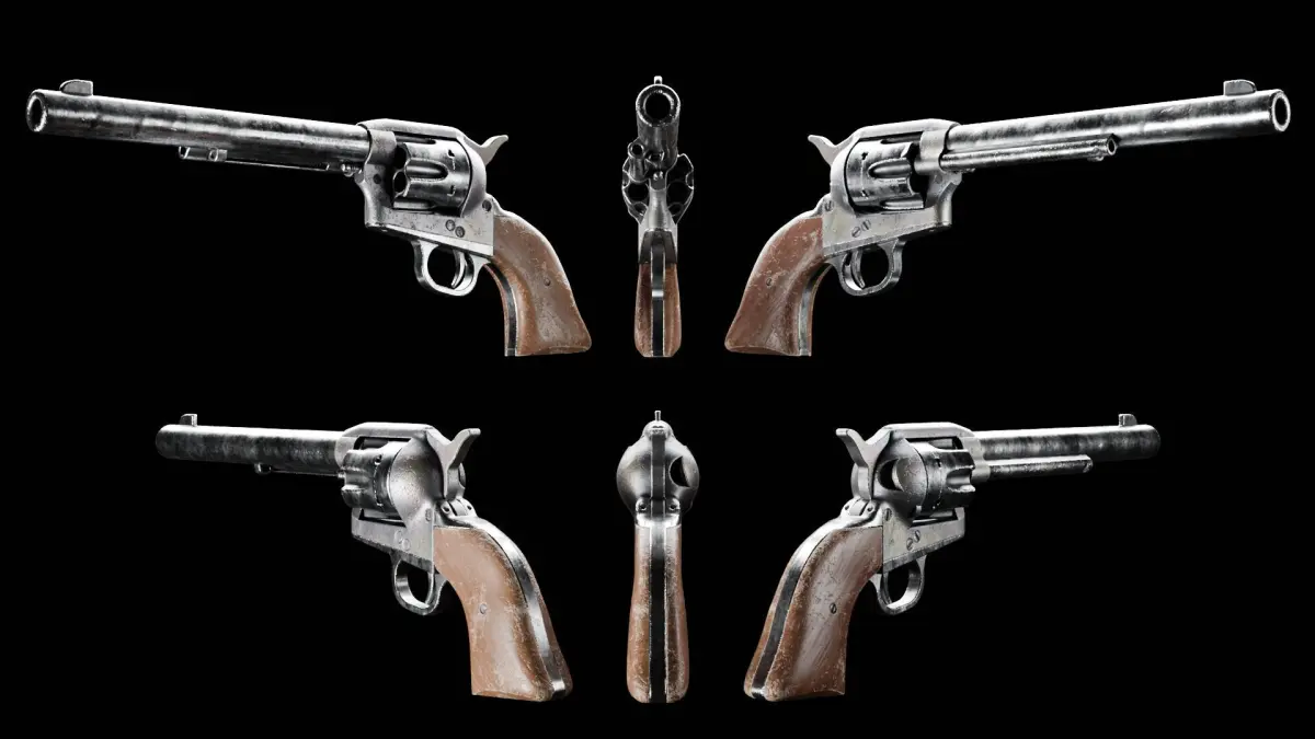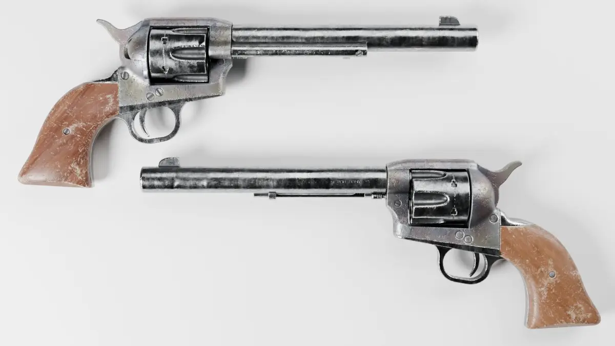 A highpoly colt single action army revolver 45 caliber with a 7.5 inch barrel.