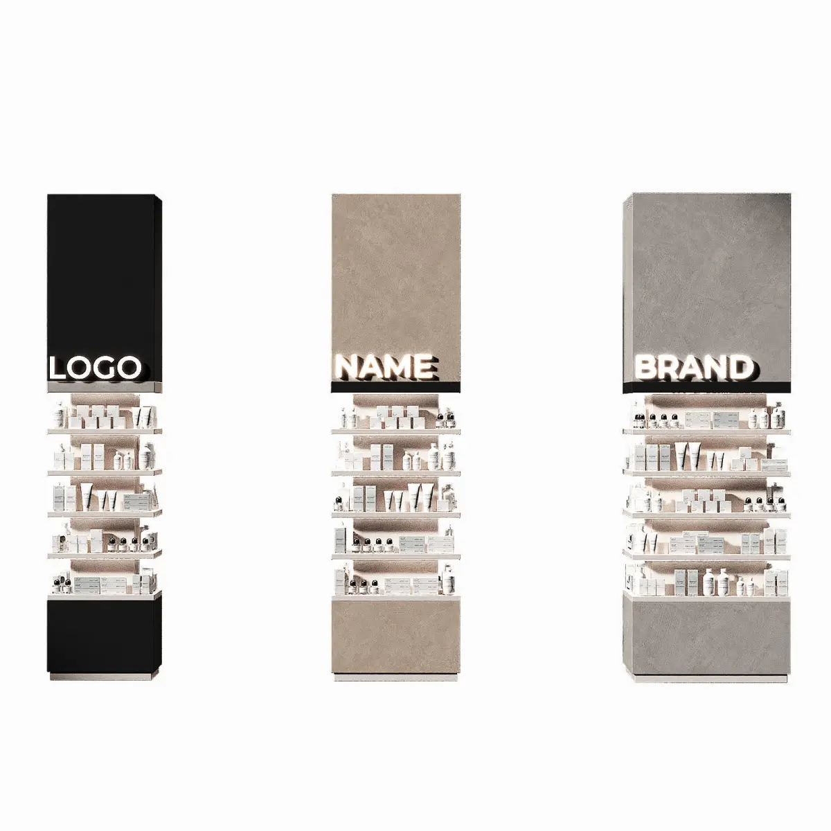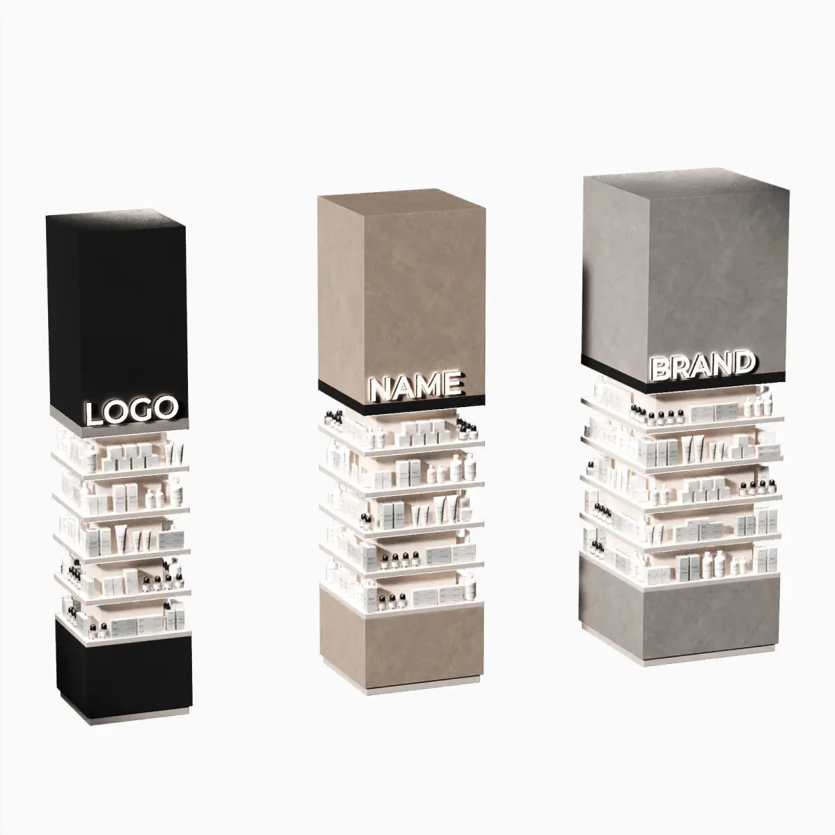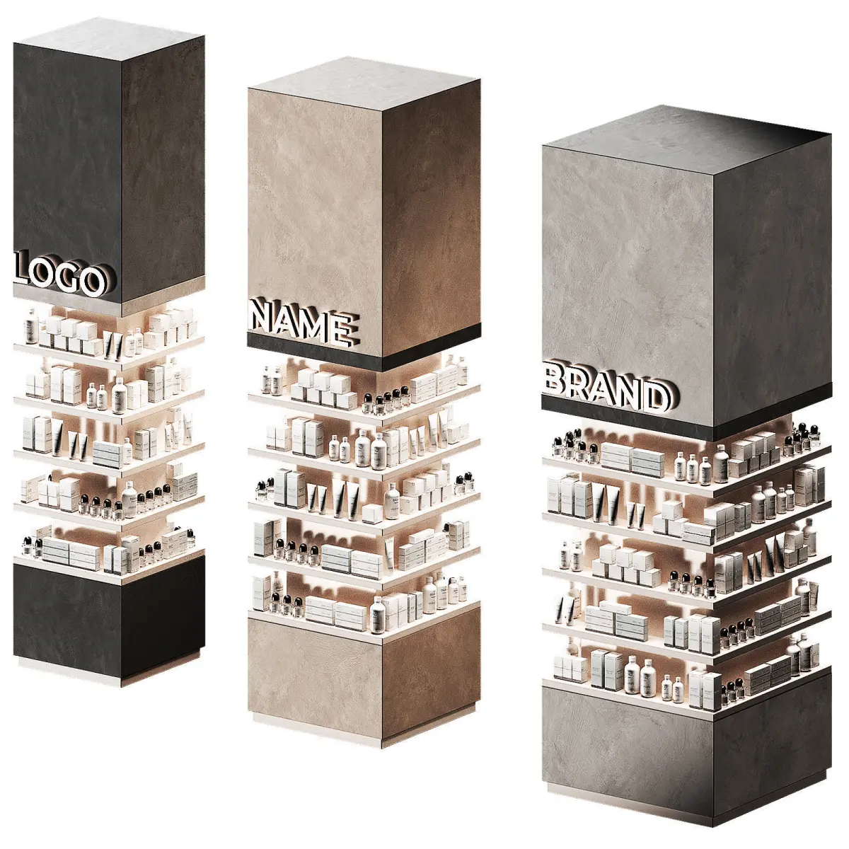3 size options 75x75 90x90 110x110cm3 color options - black, gray, beige. The color can be easily changed to any other in the material settings.The 3D model contains columns with trade products. Finishing a column post in the form of a retail rack with lighting. An island in the form of a showcase for trade in a beauty salon, shopping center, pharmacy, pharmaceuticals, perfumery. Boxes, tubes, bottles, jars with cosmetics and medications in white packaging.