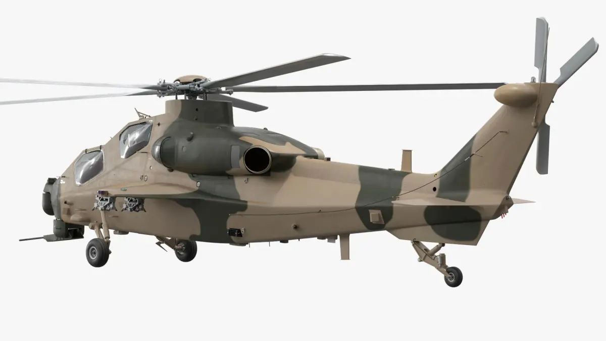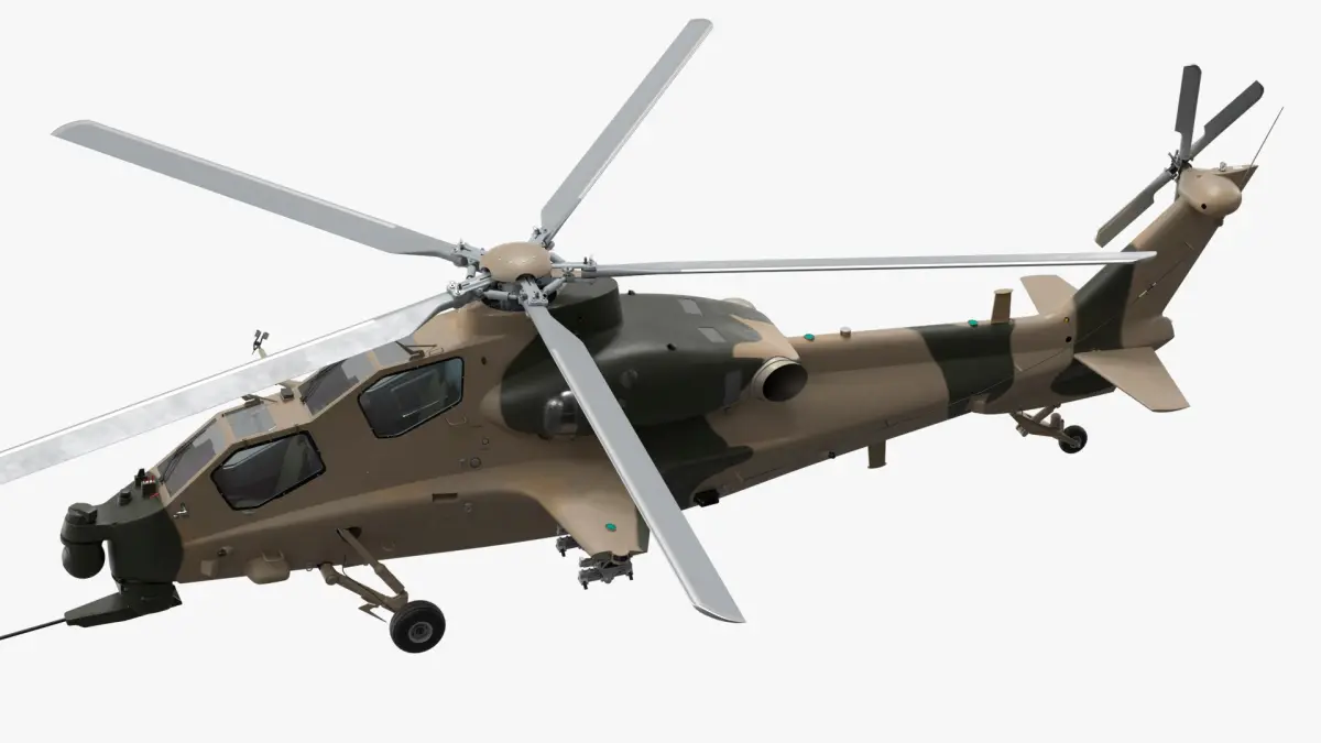 Combat Helicopter Desert Camouflage Simplified is a three-dimensional model of a modern attack helicopter, meticulously designed with a desert camouflage scheme for realistic military and simulation applications.