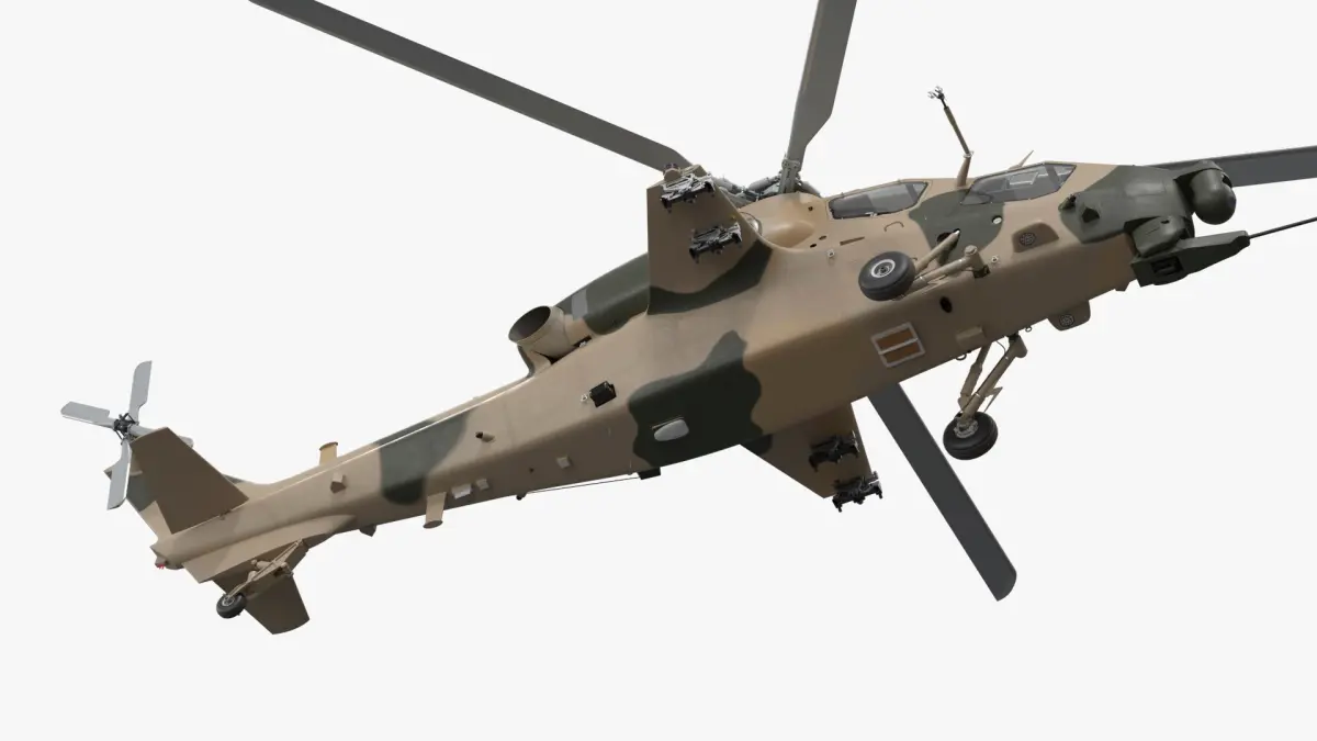 This model features detailed external geometry while maintaining an optimized polygon count for efficient rendering and real-time performance. Its design includes core components such as rotor assemblies, missile pods, landing gear, and a streamlined fuselage with sensor and weapon mounts.