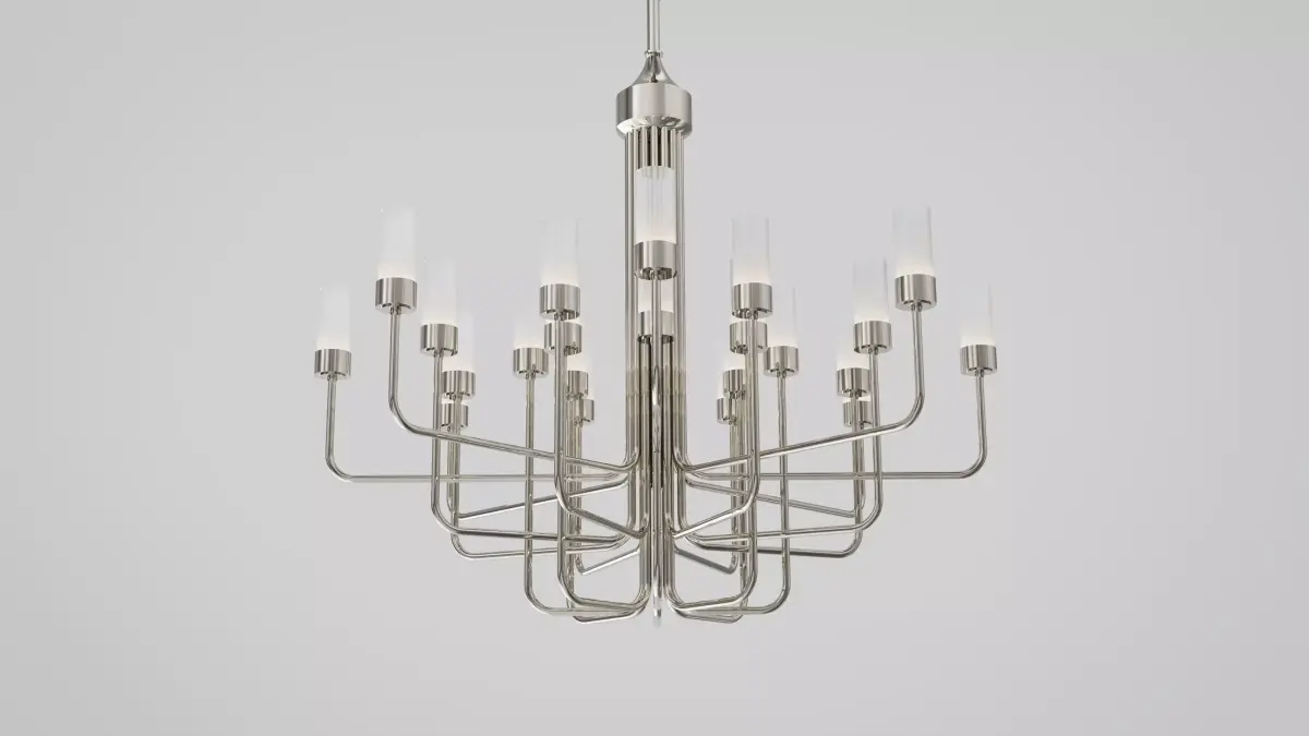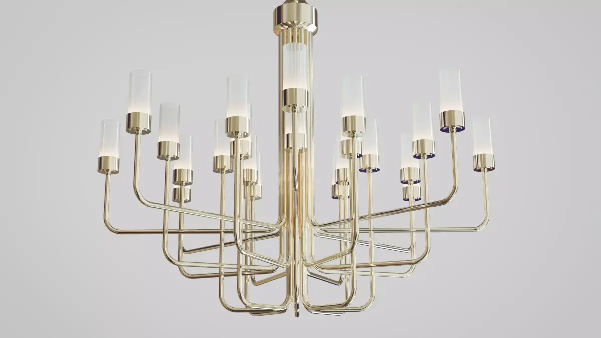 Name: Chandelier Cometa 24 cylinder glass : 3D Model Format: 3Dm , Export: 3Ds,FBX, OBJ , Render Engine: Keyshot 2025 Polygons: 615.451cm H115 L105 P15 – cm H115 W105 D15 – H45” W41” D6” , Bulbs 24xLED max 24x1wA strong artistic impact combined with effective and suggestive lighting are the qualities that distinguish the Cometa chandelier. Inspired by a contemporary and refined design, this chandelier, ideal for living rooms and living areas, is composed of a central structure of 24 brass arms in a refined light gold finish, completed in the final part by sandblasted glass details, it is a clear example of aesthetics. and application functionality.