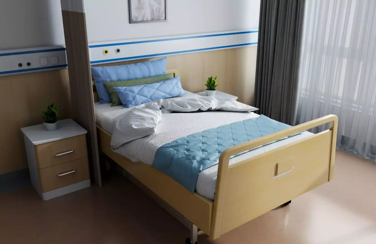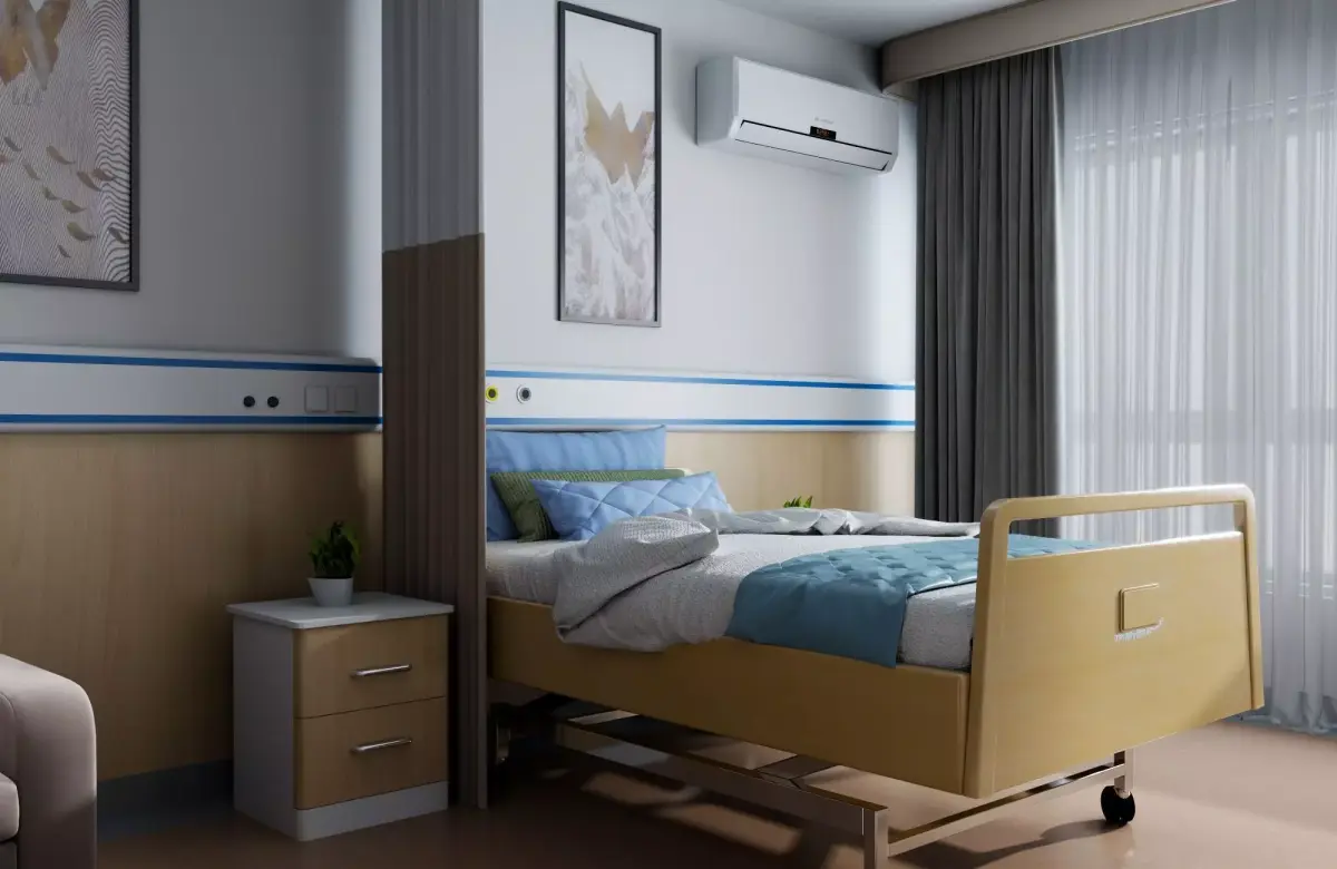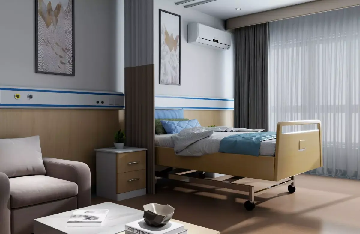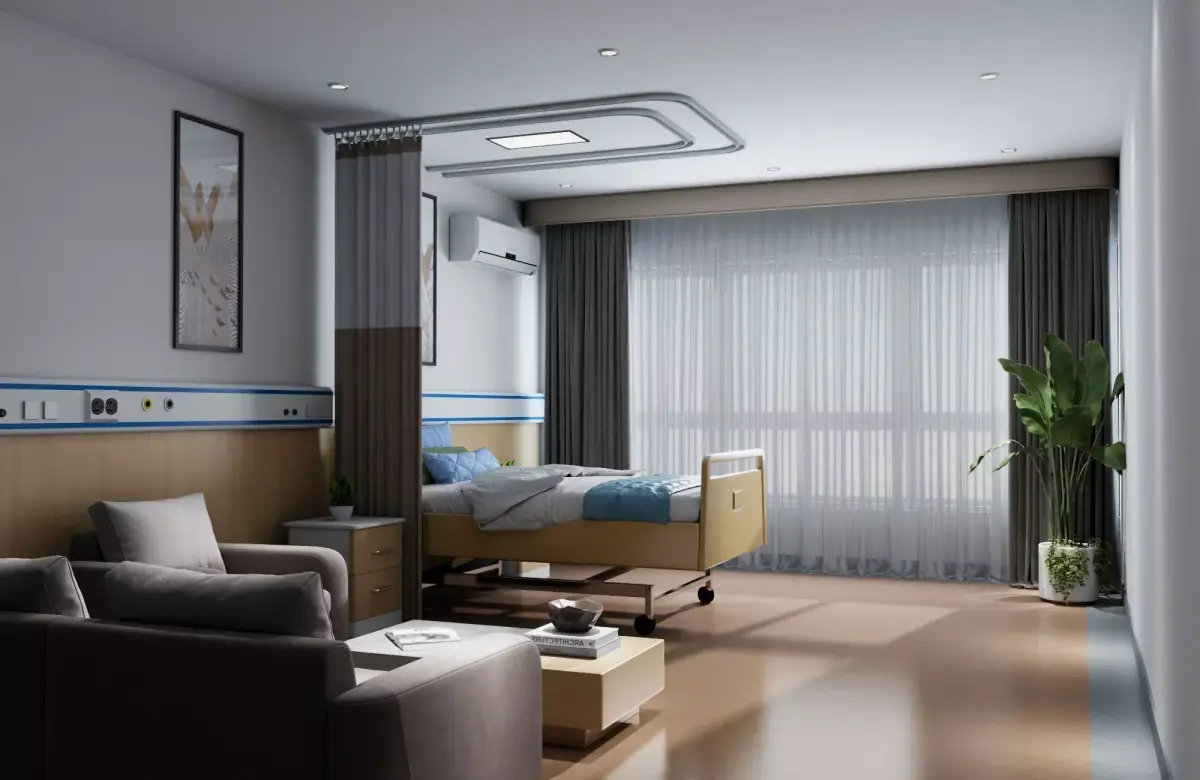 This detailed 3D model represents a serene and modern hospital patient room, designed for comfort and functionality. It features an adjustable hospital bed with blue linens and pillows, a wooden nightstand with drawers and a small potted plant, a cozy seating area including two gray armchairs and a sofa arranged around a marble-topped coffee table with stacked books and a decorative bowl. The room includes wall-mounted medical panels with outlets, switches, and ports, abstract mountain-themed artwork, a privacy curtain on a ceiling track, an air conditioning unit, large windows with sheer and dark curtains for natural light control, and warm wooden flooring. The neutral color palette creates a calming, hotel-like atmosphere. Perfect for healthcare visualizations, medical training simulations, architectural renders, or virtual reality hospital environments. Optimized with high-quality textures for fabrics, wood, metal, and glass elements