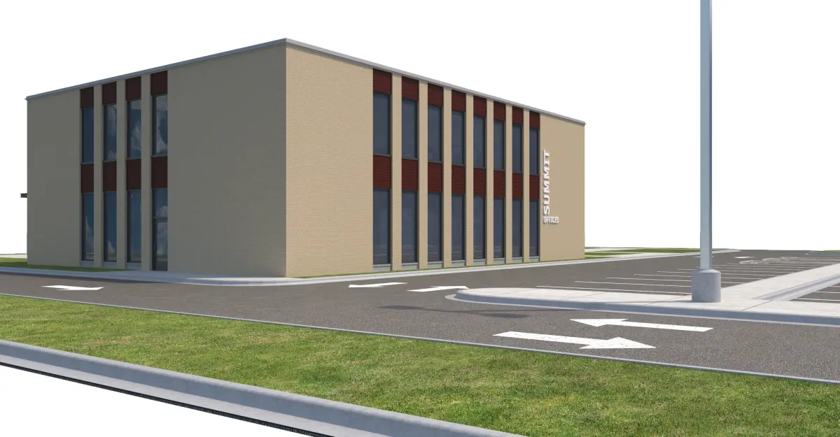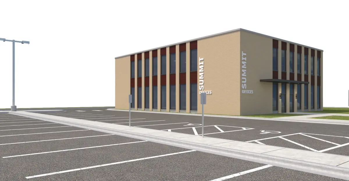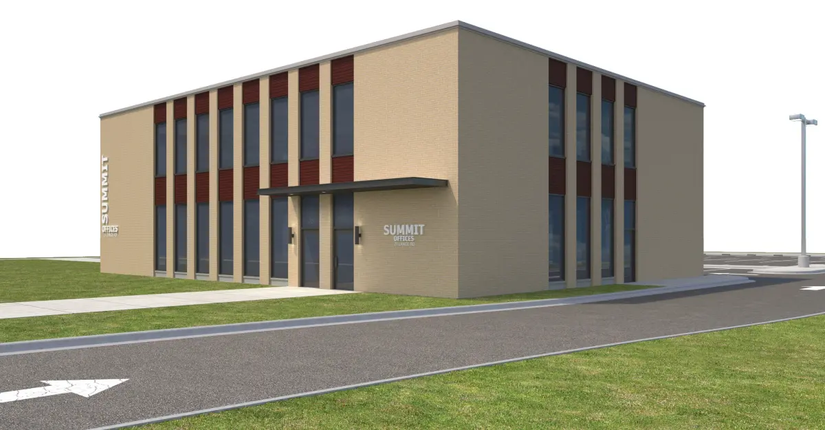 Yellow Brick with with Eifs base and Wood Accent Panels, and Black aluminum storefront mullions and a canopy at entries . Included with model are sidewalks, parking lot,, everything shown in rendering.