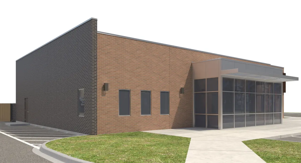 -Model includes:*Exterior Enclosure of Building*Canopies*Signage*Roof top mechanical units on curbs*Textures*Doors and windows*Light Fixture*Wood Wall Panels*Sidewalks*Handicap Signs*Parking and Directional Signs*Stop Sign*Trash Enclosure*Site Light Poles*Grass*Handicap Signs