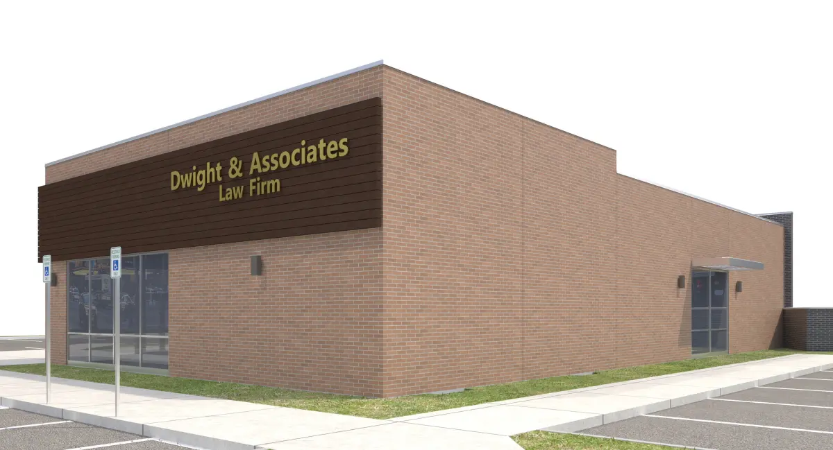 Currently Signage shows it as a Law Office, Lettering is Gold and can easily be changed in 3ds Max to any name as it is Max Text