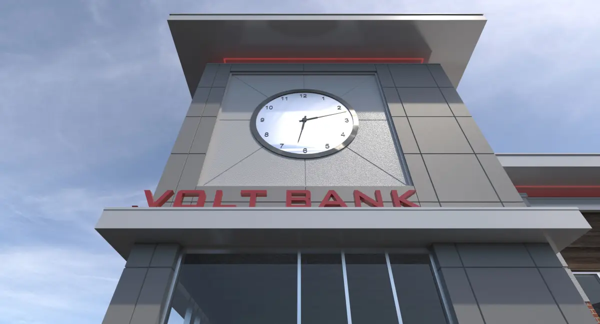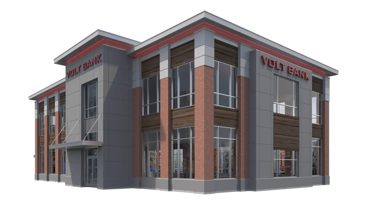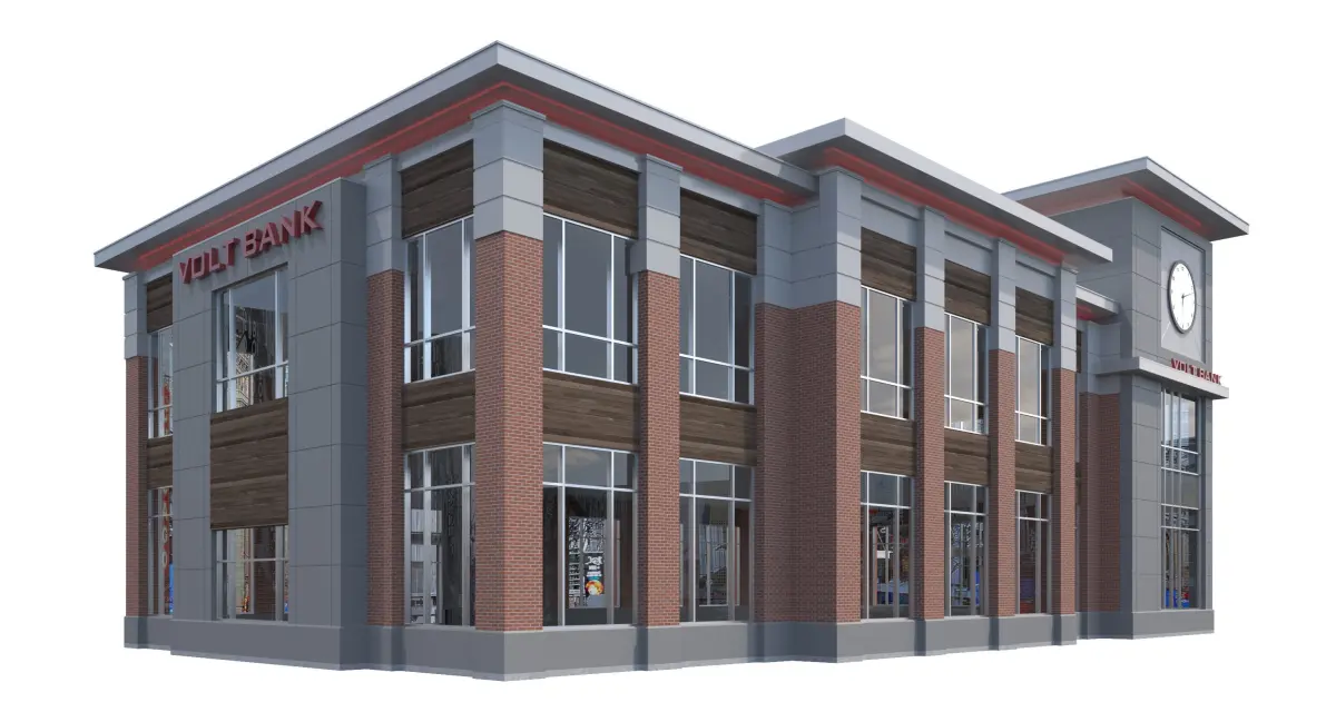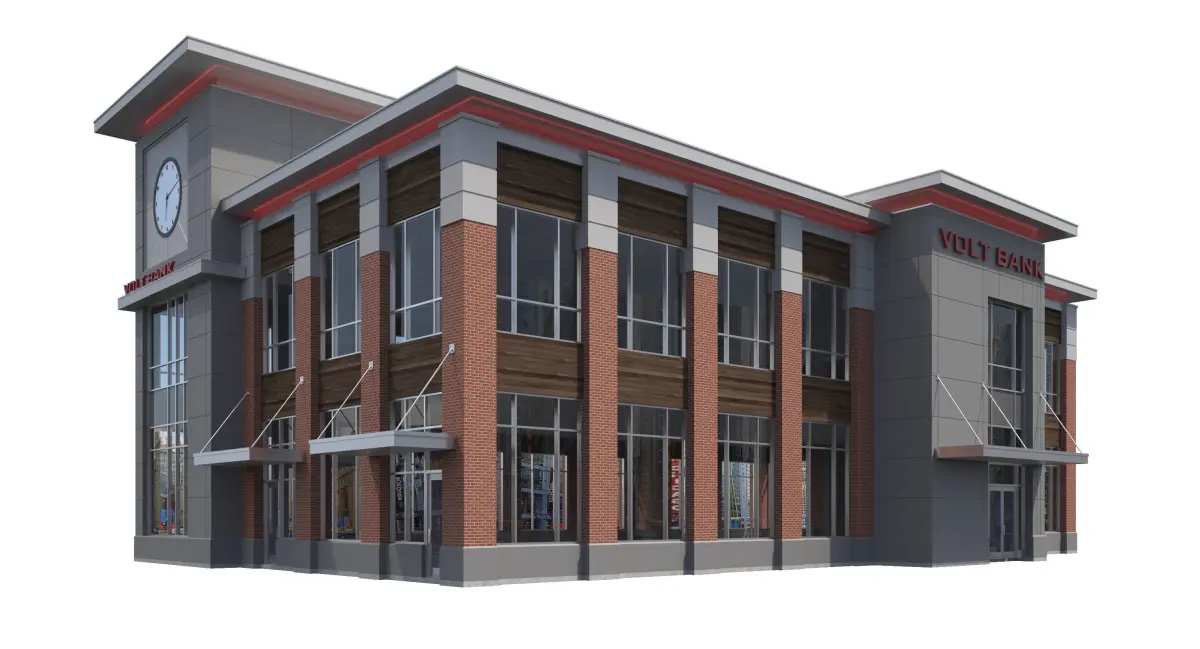 -3D model of Office Building that can be used for a Bank, or any office environment (Interior Not Modeled other than floor slab)-Materials Include: Brick, EIFS, Cast Stone, Concrete, Glass, Metal, Wood Panels-Building has Red LED lights around in roof cove.