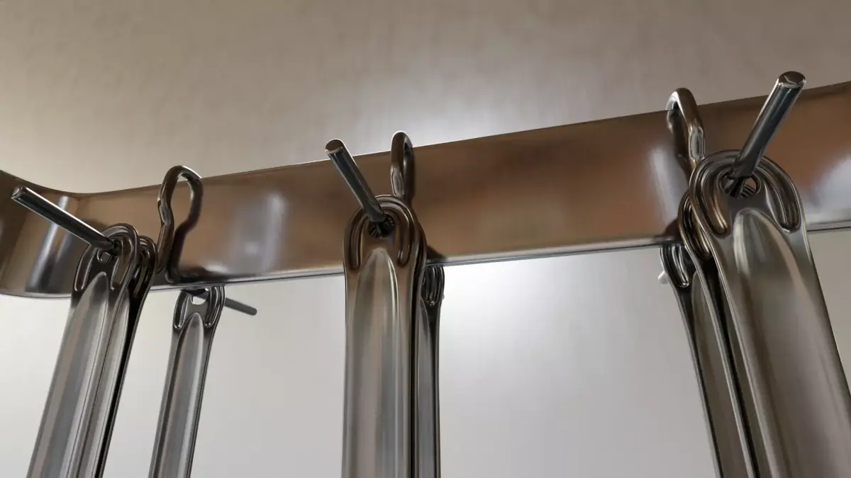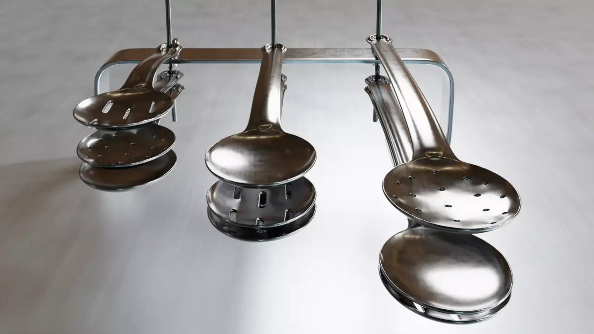 9 Commercial cooking spoons; 3 types - holy, regular, and slotted; 3 handle lengths each - 20cm, 30cm, 40cm. All positioned hanging on a commercial kitchen utelnsil rack using hanging brackets (3 brackets included to deliver the 3 positions in previews). The youtube video describes them in great detail, I think. Feel free to post questions in the comments of the youtube video.