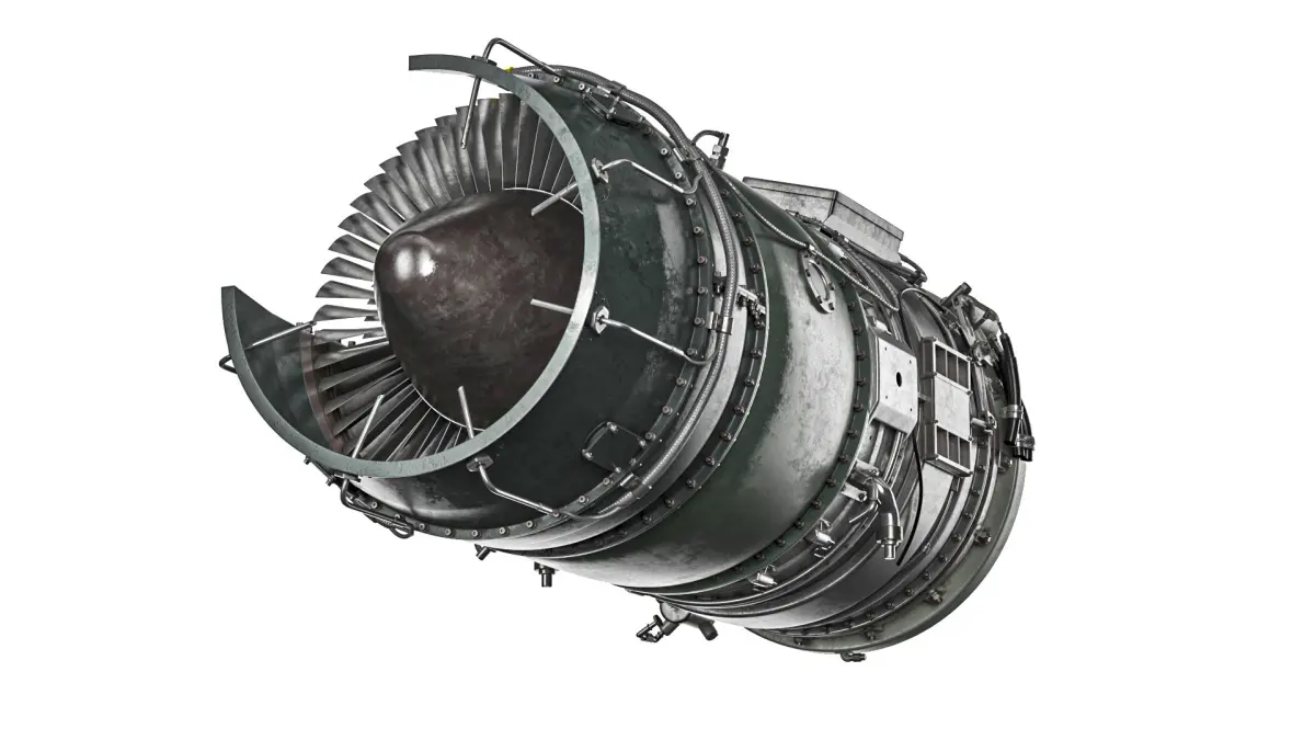 Commercial Jet Engine Cutaway is a three-dimensional model of a detailed jet engine, highlighting its internal mechanisms and workings.