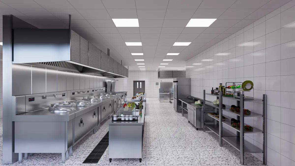 Enhance your design projects with this highly detailed 3D model of a professional commercial kitchen. This model showcases a meticulously crafted layout featuring high-quality textures and elements, including stainless steel countertops, industrial-grade appliances, storage units, and functional workstations. Designed for optimal workflow, the kitchen setup includes cooking ranges, refrigeration units, preparation areas, and dishwashing stations, all arranged to meet industry standards. Fully customizable, you can adjust materials, colors, and equipment to match your specific requirements. Compatible with popular 3D software, this model ensures easy integration into your projects. Ideal for architects, restaurant designers, and 3D artists, this model helps visualize efficient and practical kitchen designs for restaurants, hotels, or culinary schools. Elevate your projects with this realistic and professional commercial kitchen 3D model, perfect for showcasing modern and efficient kitchen layouts.