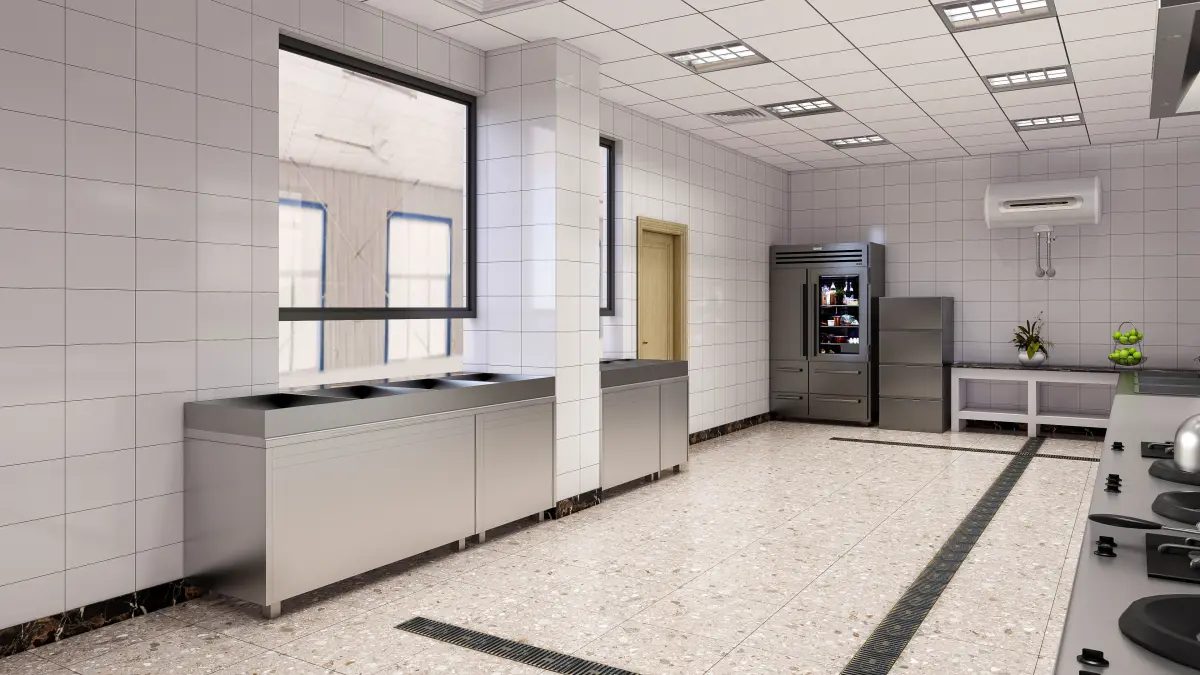 Enhance your design projects with this highly detailed 3D model of a professional commercial kitchen. This model showcases a meticulously crafted layout featuring high-quality textures and elements, including stainless steel countertops, industrial-grade appliances, storage units, and functional workstations. Designed for optimal workflow, the kitchen setup includes cooking ranges, refrigeration units, preparation areas, and dishwashing stations, all arranged to meet industry standards. Fully customizable, you can adjust materials, colors, and equipment to match your specific requirements. Compatible with popular 3D software, this model ensures easy integration into your projects. Ideal for architects, restaurant designers, and 3D artists, this model helps visualize efficient and practical kitchen designs for restaurants, hotels, or culinary schools. Elevate your projects with this realistic and professional commercial kitchen 3D model, perfect for showcasing modern and efficient kitchen layouts.