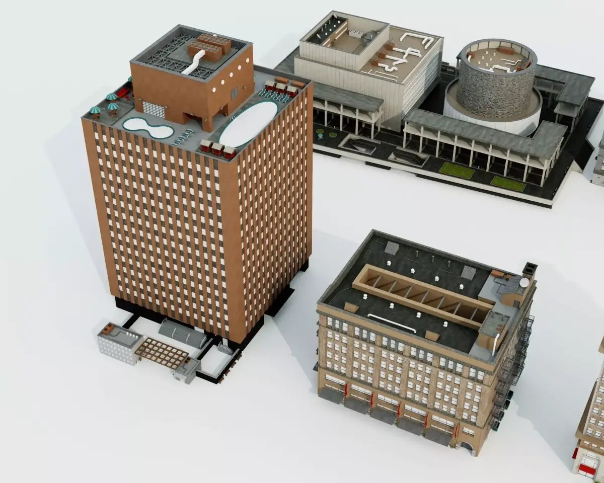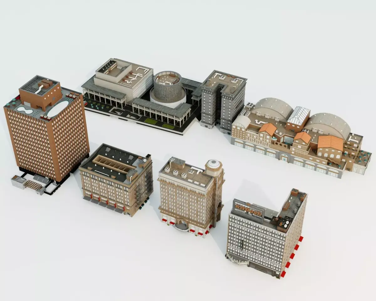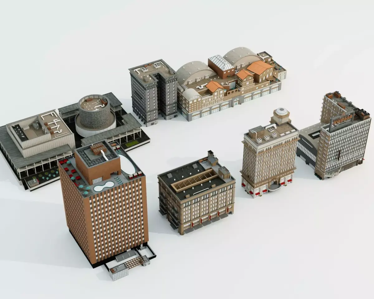 This versatile 3D model pack includes 12 unique industrial and commercial buildings suitable for urban environments, featuring a mix of brick warehouses, modern office blocks, factories with silos and smokestacks, rooftop pools, water towers, HVAC units, helipads, and detailed facades with windows, doors, and signage (including a KillBASH branded building). Models showcase varied architectural styles with realistic weathering, rooftop clutter, and high-detail elements. Low-poly optimized with PBR textures and clean topology – perfect for cityscape fillers, industrial zones, game levels, animations, VR scenes, or architectural visualizations.