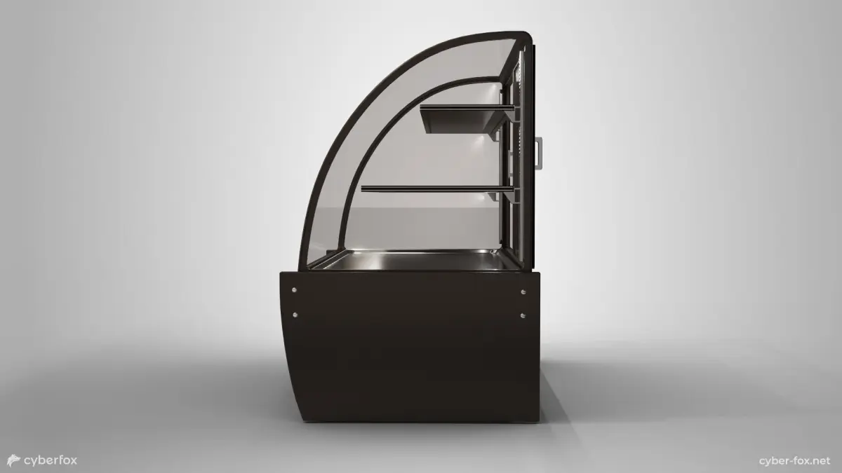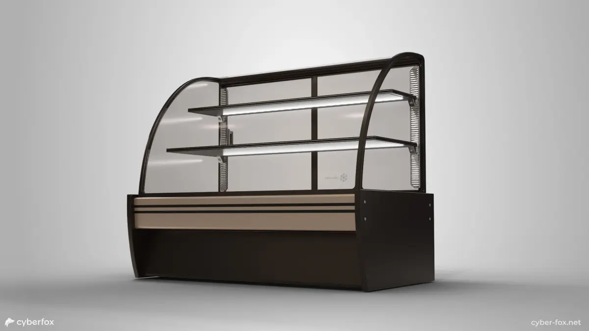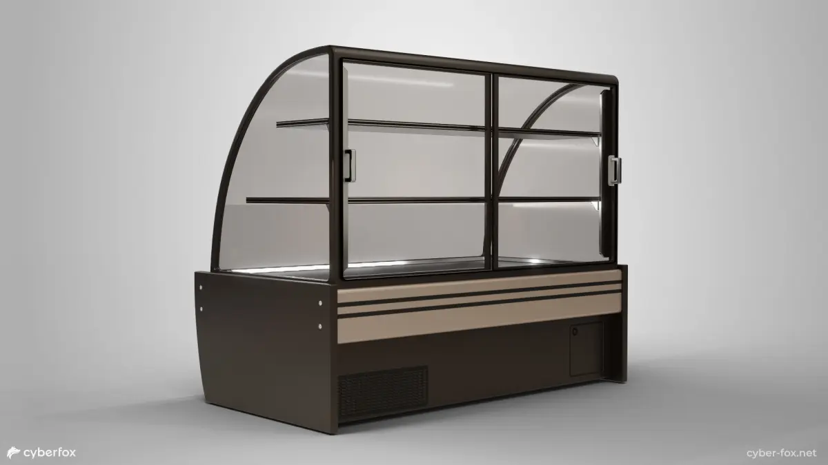 A 3D model of a refrigerated display case with curved glass, designed for showcasing ready-to-eat meals, desserts, and beverages. The model is detailed, includes shelves, and is perfect for visualizing interiors of cafes, shops, and restaurants.