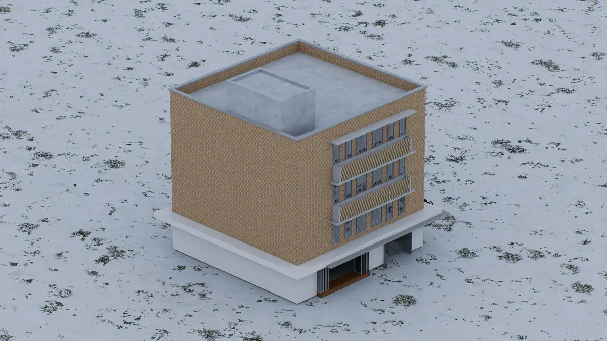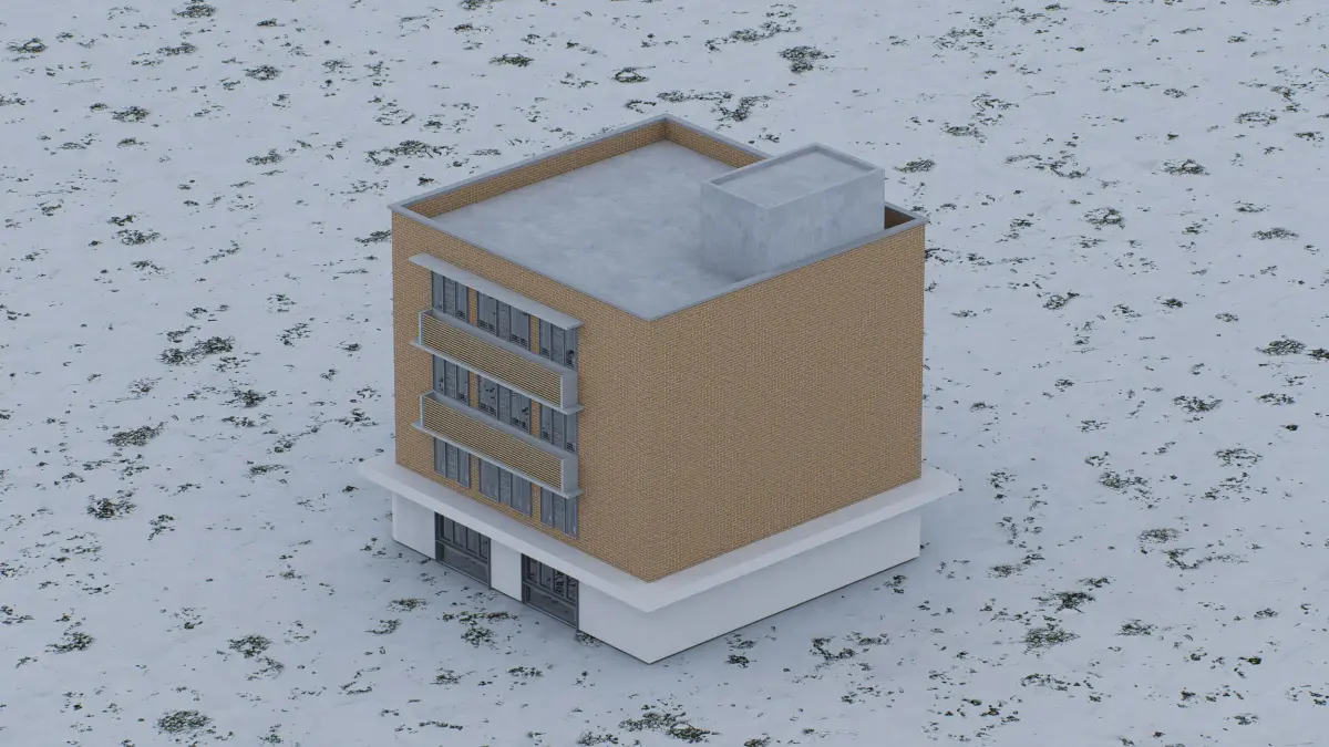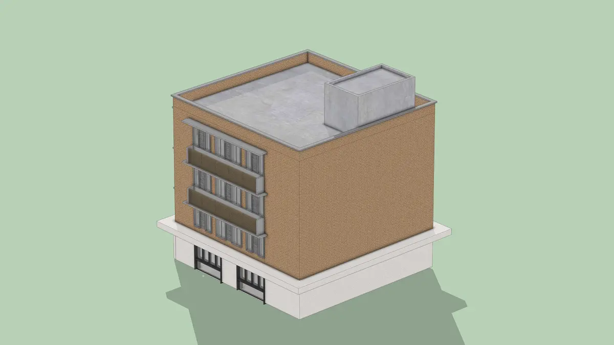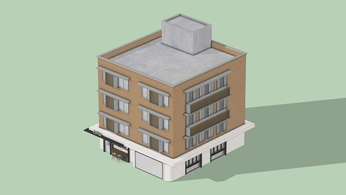 This 3D model represents a commercial-residential building with a modern yet functional design. The structure features a brick exterior with multiple floors, combining residential windows and balconies with a ground-level commercial space, indicated by a Coffee storefront. The flat roof includes a small rooftop structure, adding to its urban aesthetic. Subtle shading and minimalistic details enhance its suitability for cityscape visualizations, architectural prototypes, or gaming environments, blending residential living with commercial vibrancy.