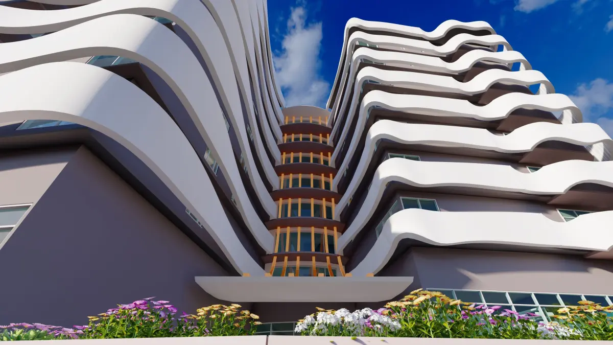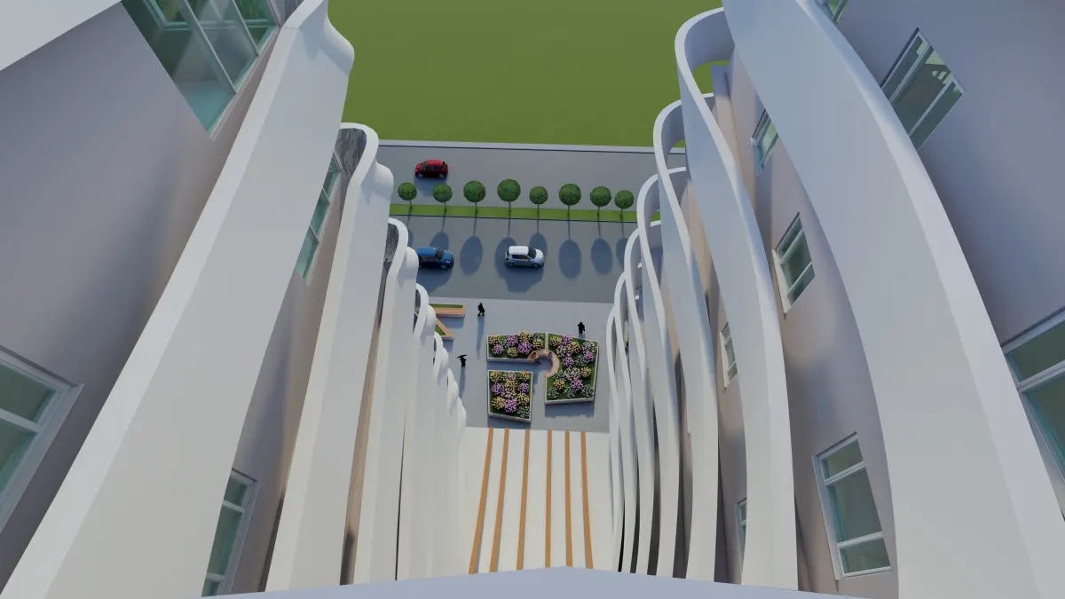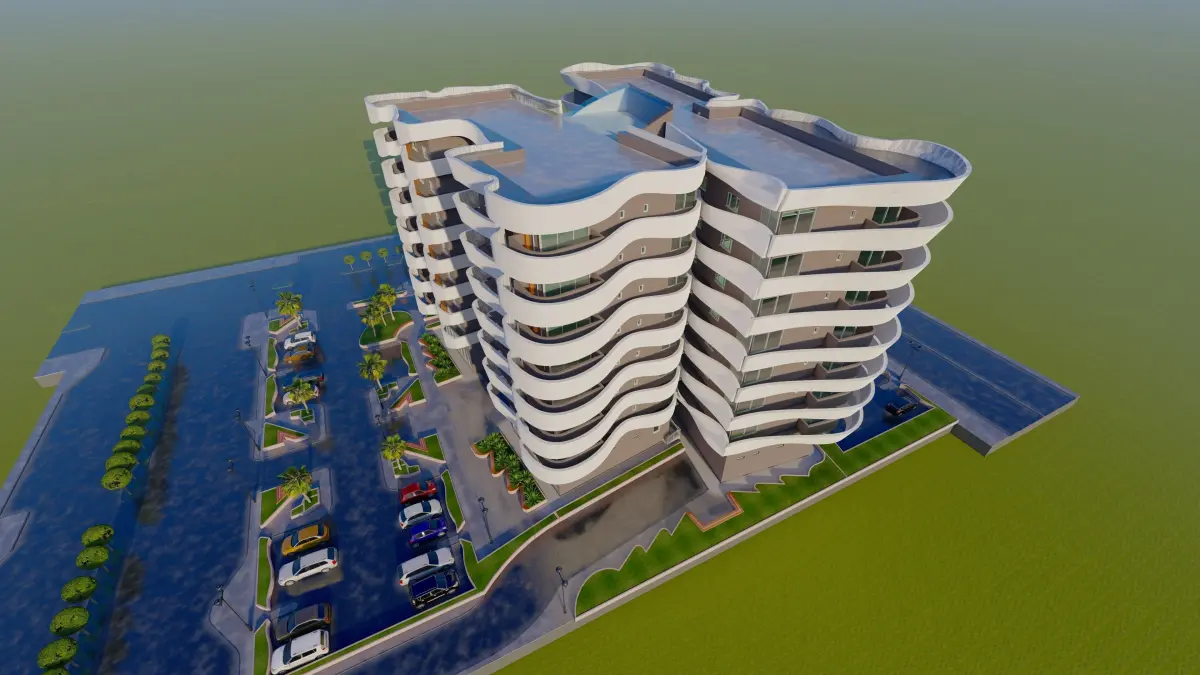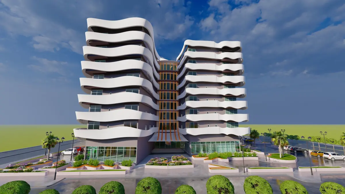 Design of a commercial residential building consisting of 9 floors. The ground floor consists of a mini mall and a supermarket (and has a back exit to access goods and stores) and also a restaurant. As for the upper floors, they are residential of two types of apartments: a large apartment and a small apartment. (The details of the large apartment consist of: A bedroom suite with a bathroom + three bedrooms + a living hall + a dining room + a bathroom + a kitchen + a storeroom + two balconies), (the details of the small apartment consist of a bedroom suite with a bathroom + two bedrooms + a living hall as a corridor between the functions + a dining room + a bathroom + kitchen + two balconies), and there is also a private entrance to the residential apartments and private parking for them, and three entrances to the commercial part and private parking for them. There is a landscape with stunning views and seating areas for customers.