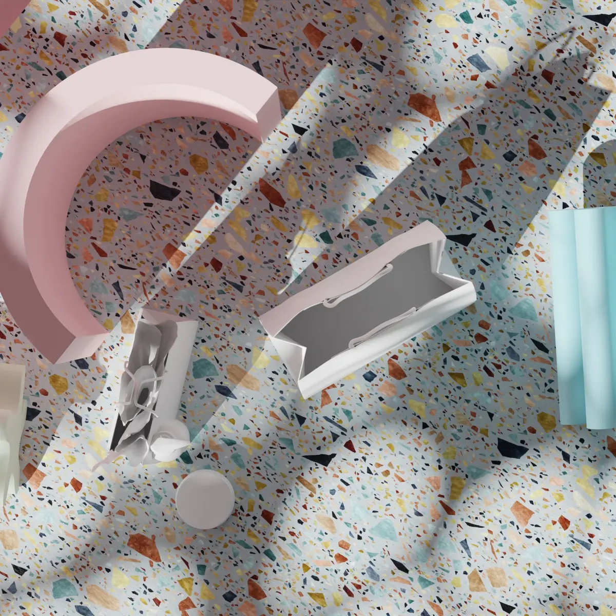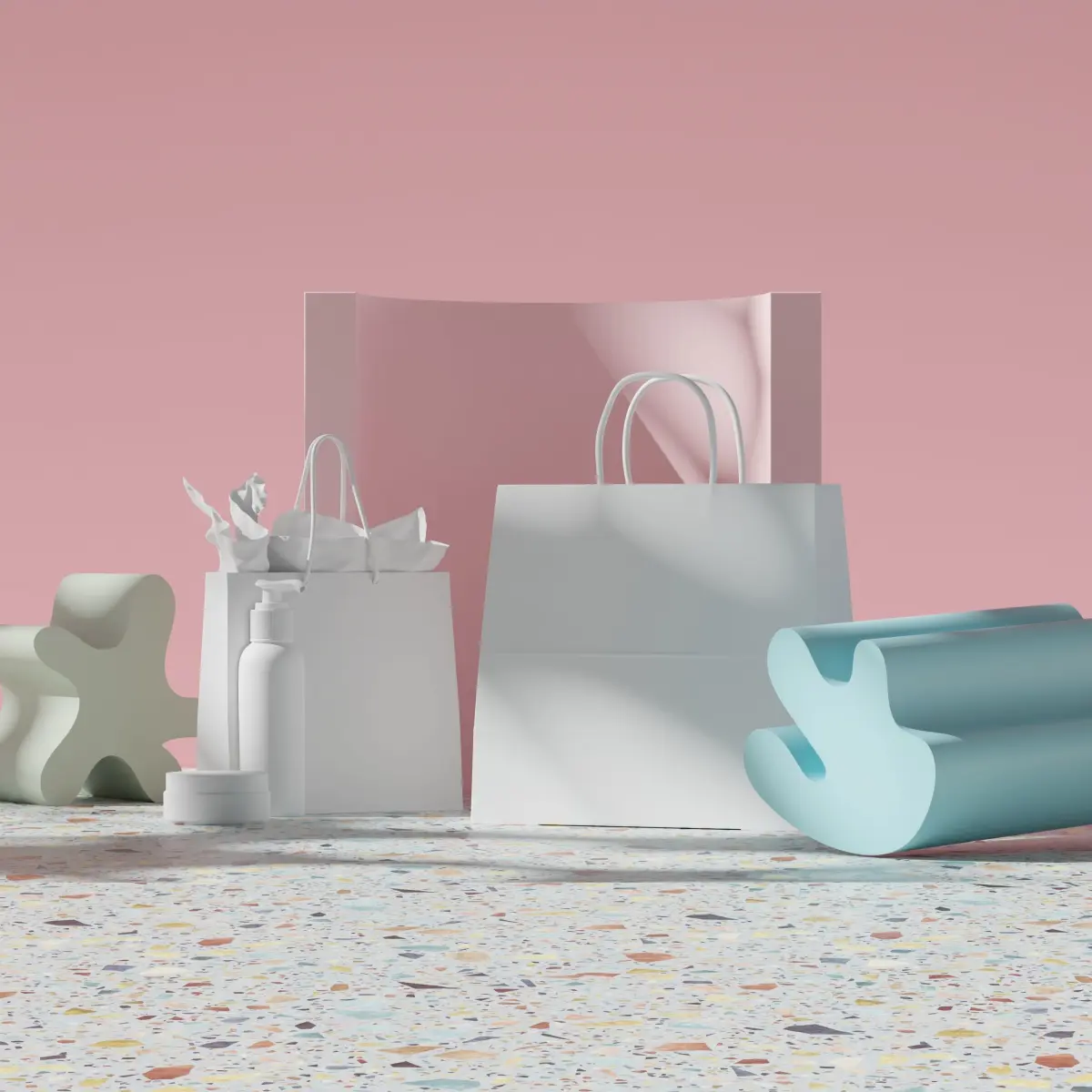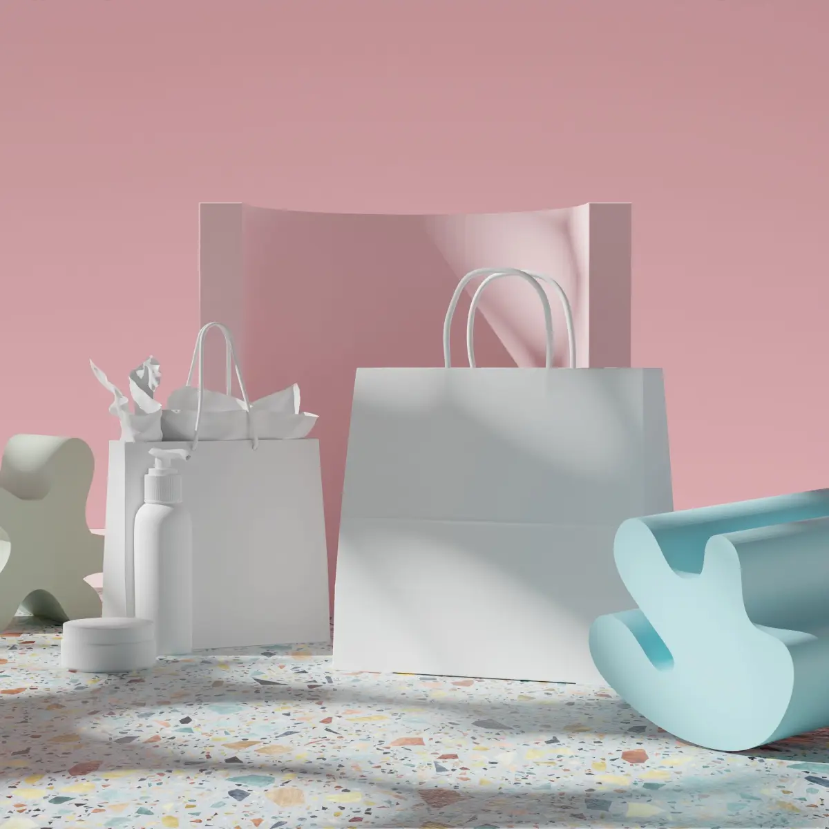 Commercial shopping bags mockup scene with terrazzo floor. Few ready made cameras. Ready to render