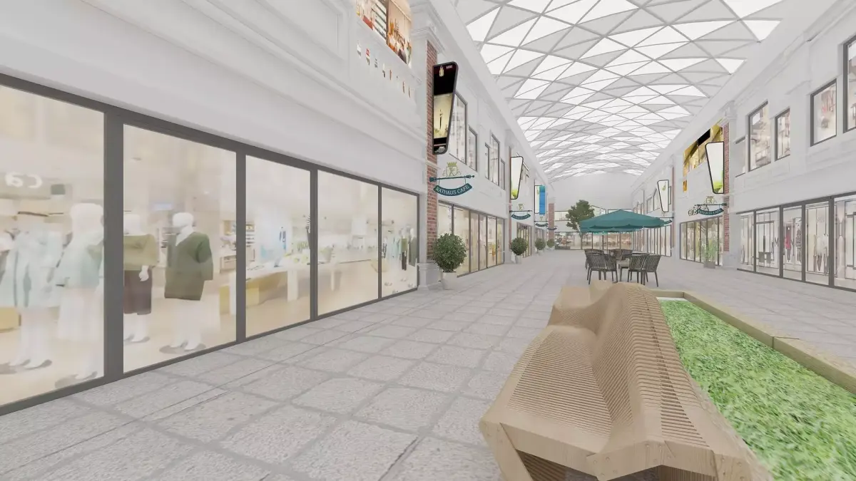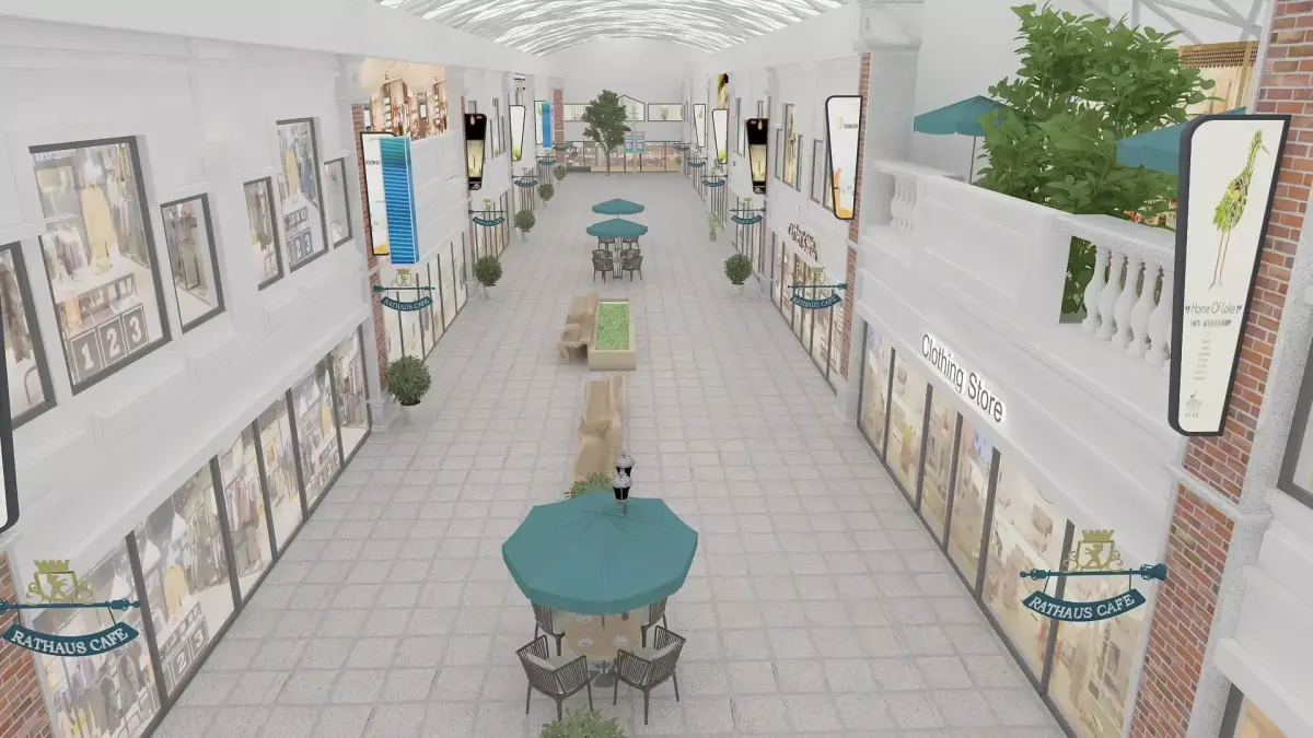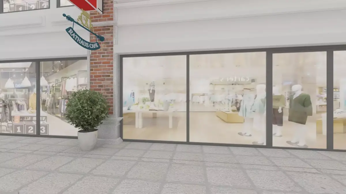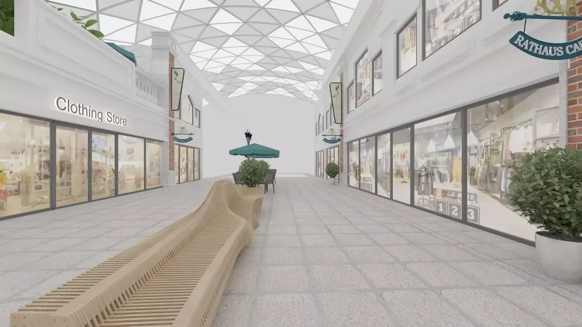 Shopping street with varios store fasades and patio furniture.