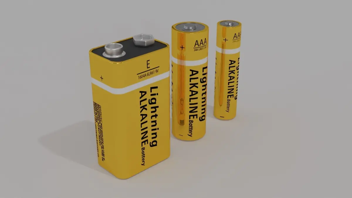 Battery pack type:AAA 1,5V BatteryAA 1,5V BatteryE 9V BatteryReal-size model: AA: 50.0 mm lenght , 14.0 mm diameter AAA: 44.5 mm lenght , 10.5 mm diameter E: 17.5 mm depth, 26.5 mm width, 48.5 mm height. Made in blender, exported to different format (.obj, .fbx, .ply)Rendered with Blender CyclesTexture Included