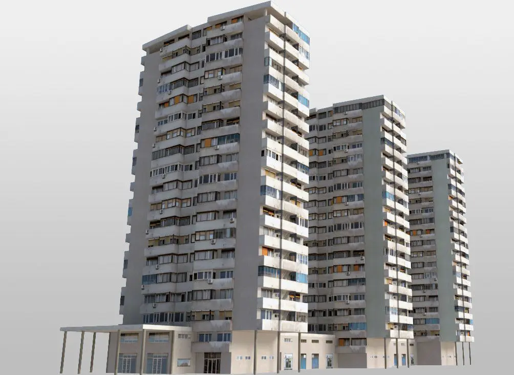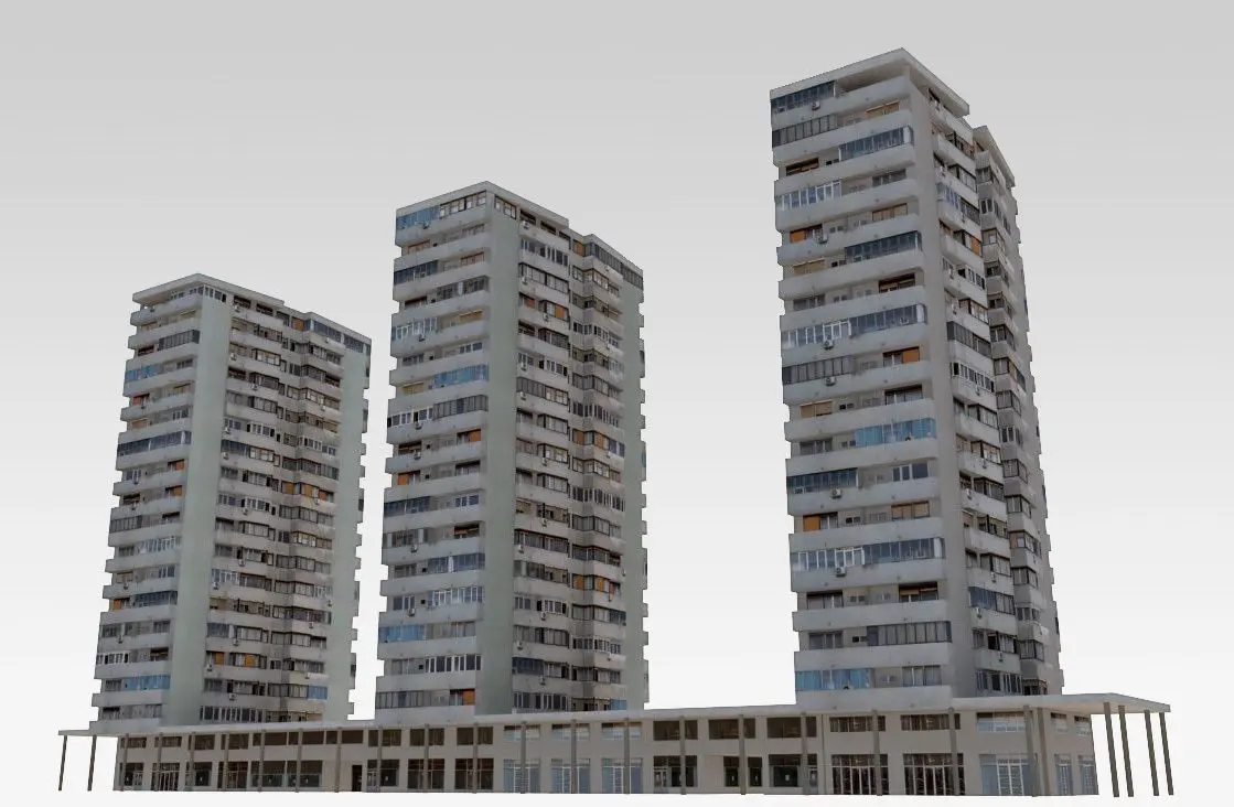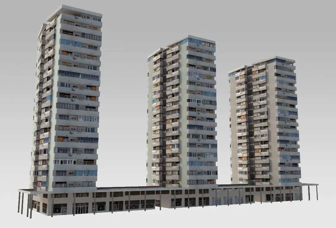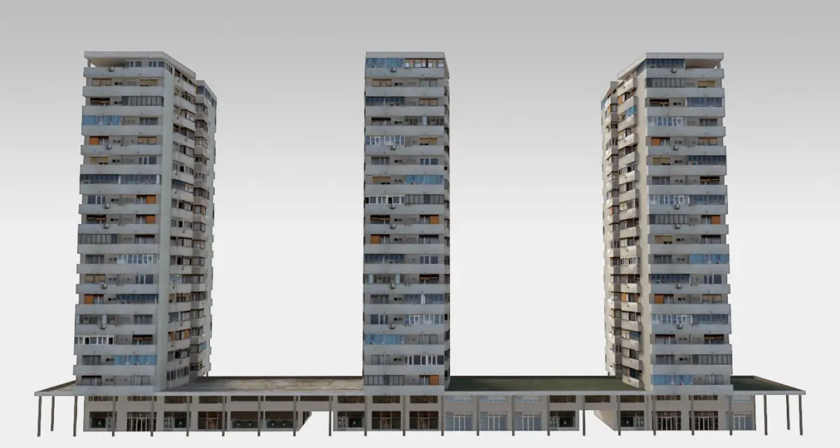 Buildings typical for communist architecture in eastern Europe - high density residential towers connected with a horizontal annex, lays on a frequent street or boulevard. Although aesthetics are not primary characteristic of such architecture, they are very urban and contribute to the city skyline. Low-poly, photo textured.