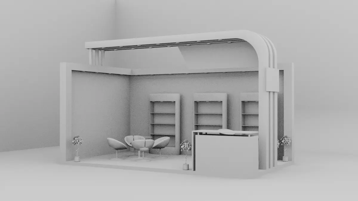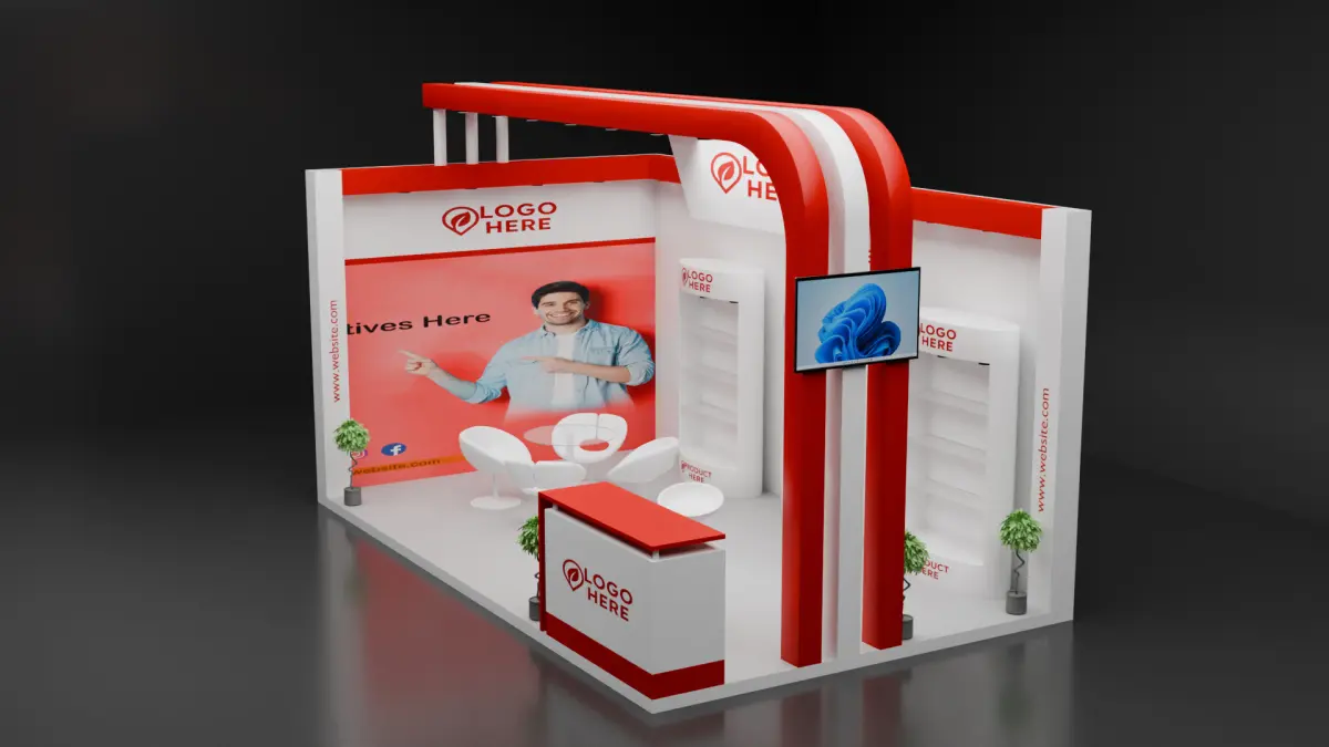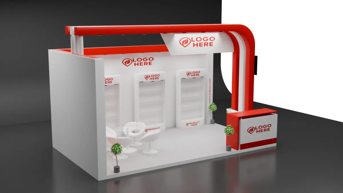 **3D Exhibition Stall Design Description**This 3D exhibition stall, designed and rendered in Blender 4.3 with Cycles, showcases a compact yet impactful design ideal for focused brand presentations in small spaces. The bold red-and-white palette is clean, modern, and perfect for attracting attention within crowded exhibition halls.