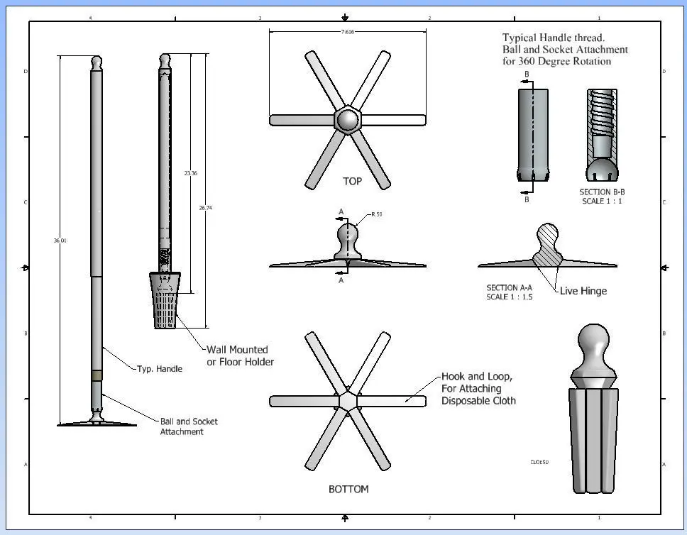 Vary compact (1.6" in the closed position) floor cleaning deviceThis Unit uses a typical handle that is already in the market.(I didn't get to detailed in the handle system)It has a Ball and Socket Attachmentfor 360 Degree Rotation. A disposable cleaning padis attached via Hook and Loop system.The devise uses Live hinges (Right angle Hinge Design) that can be created by injection molding so it minimizes extra parts.I envisioned the devise being stored in a small cylinder type tube with an opening of 2"