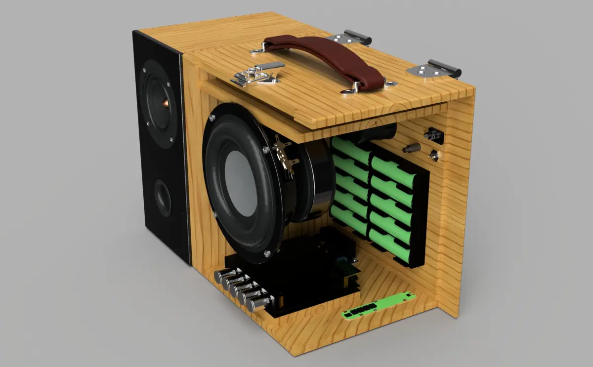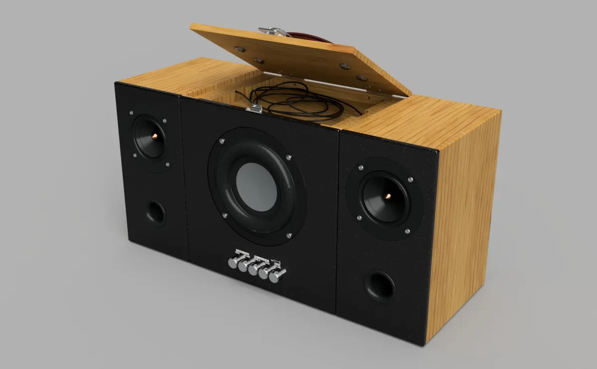 Compact Boombox is modeled with Fusion 360. Rendered with KeyShot 9. 3D Studio Max 2017 version and also added 2014 version. 1:1 Scale in real sizes. Unit's millimeters. Includes all scene, lighting, cameras, materials and textures. Many file formats are available. Speakers can be separated or combined. In this way, it can be used on desktop computers or portable, if desired. This is a DIY product. You can buy ready-made components and do it yourself. Links for parts to be purchased are provided. Chipboard and MDF can be used as wood. The bass speaker used is 100 Watt, the right and left speakers are 15 Watts.