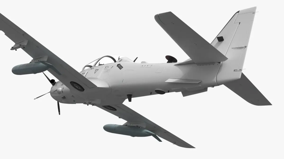 Compact Military Attack Plane with External Fuel Tanks White is a 3d model of a versatile military aircraft, designed for counterinsurgency and close air support missions.