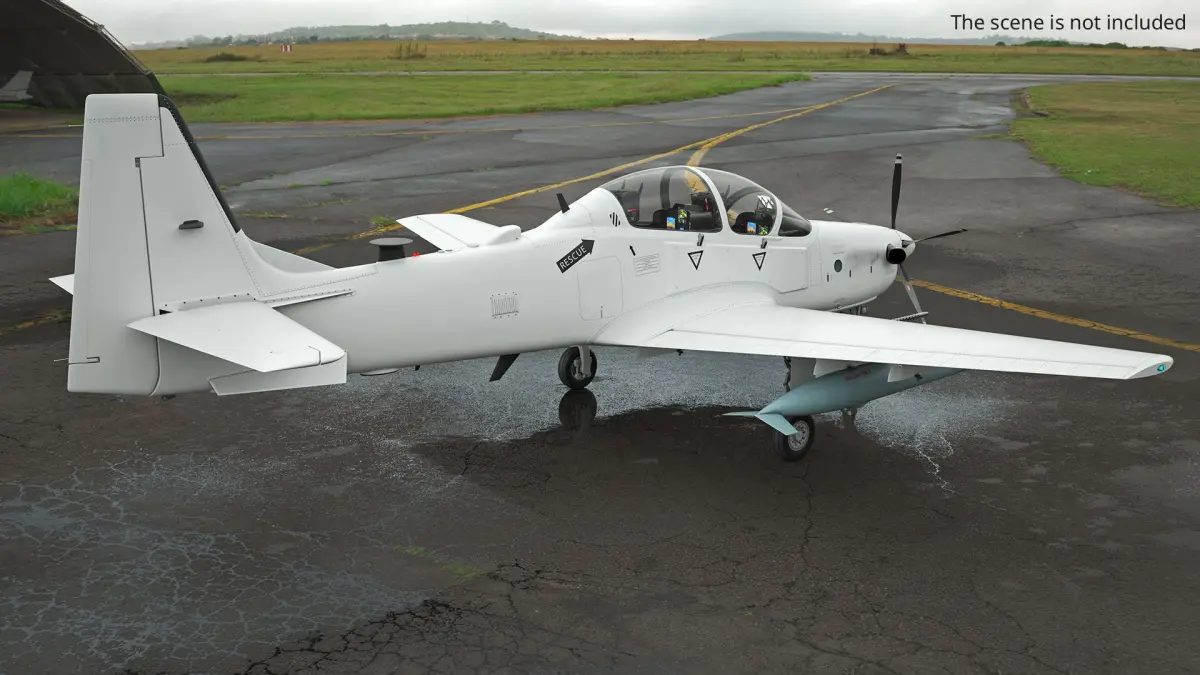 The model showcases the aircraft's detailed design, featuring a twin-seat cockpit, distinctive propeller, and robust landing gear. Equipped with advanced avionics, the Super Tucano is celebrated for its agility, durability, and capacity to carry a wide range of weapons and auxiliary fuel tanks.