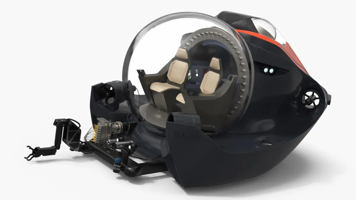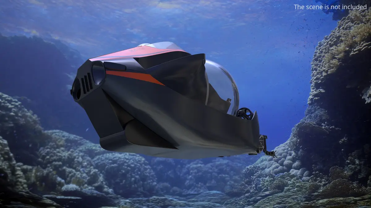 This sleek submersible features a matte black hull with red accents and a clear dome canopy that reveals a detailed interior with dual seats and a digital control interface. The model includes functional elements such as side propellers, a manipulator arm with wiring, and lighting fixtures for deep-sea operations. Fully rigged, this model supports animation workflows and interactive scenes, bringing high realism to underwater projects.
